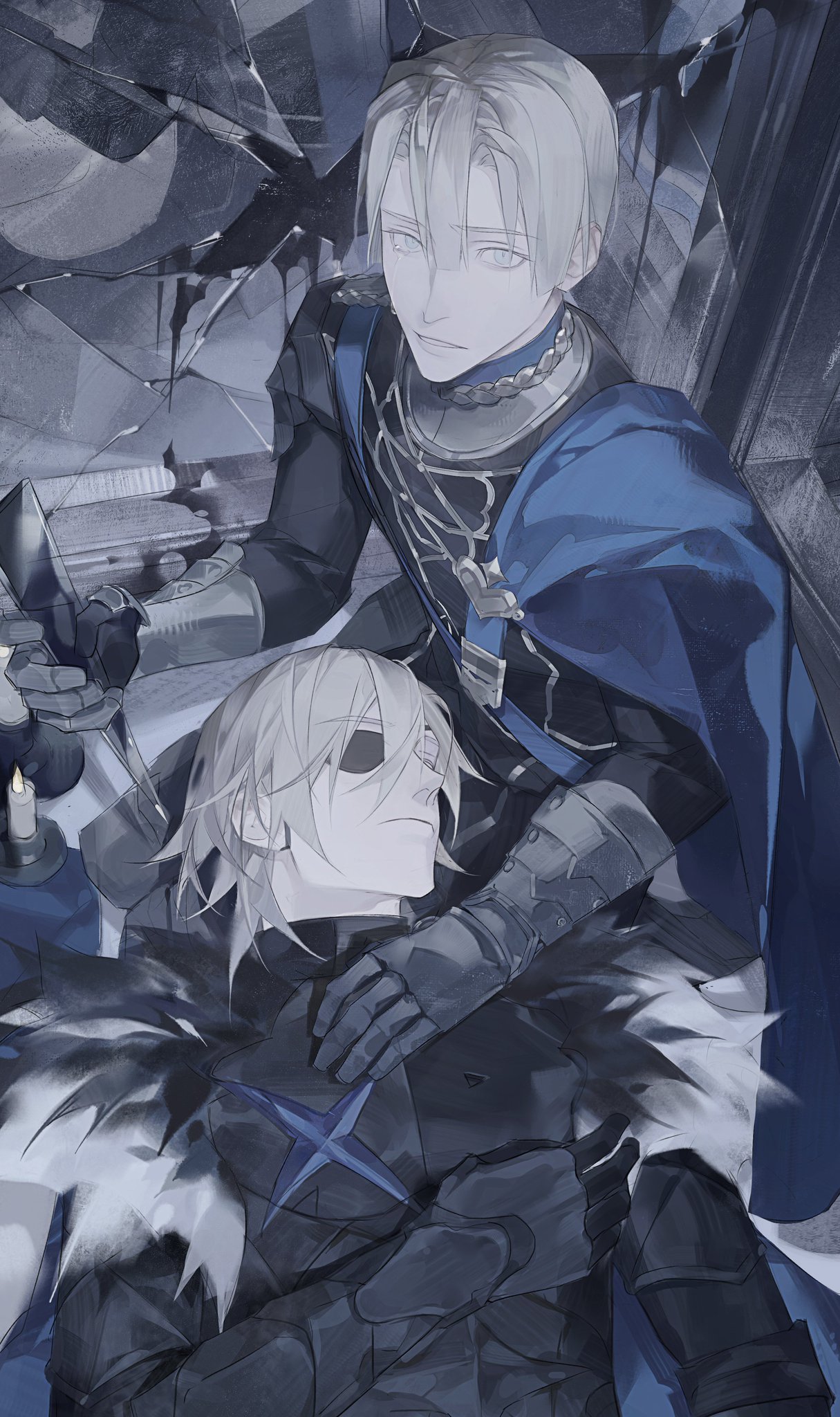 1boy armor armored_gloves black_armor black_fur black_gloves black_pants black_shirt blonde_hair blue_cape blue_eyes bracer broken_glass broken_mirror candle cape closed_eyes closed_mouth crying dimitri_alexandre_blaiddyd dual_persona eyepatch fire_emblem fire_emblem:_three_houses fur_trim garreg_mach_monastery_uniform glass glass_shard gloves gold_trim hair_between_eyes hand_on_another's_chest hand_on_own_chest highres holding_glass_shard kneeling lap_pillow looking_at_viewer lynnn28208524 male_focus mirror nintendo one_eye_covered pants parted_lips shirt side_cape single_bracer solo streaming_tears tears white_fur