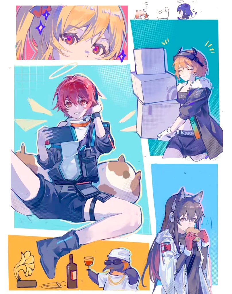 4girls animal_ear_fluff animal_ears arknights bag beanie bird black_hair black_jacket black_shirt black_shorts black_sports_bra blonde_hair blue_hair bottle box brown_eyes burger cardboard_box coat colored_inner_hair cow_horns croissant_(arknights) cup detached_wings drinking_glass earpiece emperor_(arknights) energy_wings exusiai_(arknights) exusiai_(midnight_delivery)_(arknights) fiammetta_(arknights) food fur-trimmed_hood fur-trimmed_jacket fur-trimmed_sleeves fur_trim gloves halo hat headset hood horns id_card jacket lin_qing_(phosphorus_1104) mostima_(arknights) multicolored_hair multiple_girls official_alternate_costume orange_hair penguin penguin_logistics_(arknights) red_gloves red_hair shirt shorts shoulder_bag shoulder_strap sports_bra sunglasses texas_(arknights) texas_(winter_messenger)_(arknights) visor_cap white_gloves white_jacket white_shirt wine_bottle wine_glass wings winter_clothes winter_coat wolf_ears wolf_girl