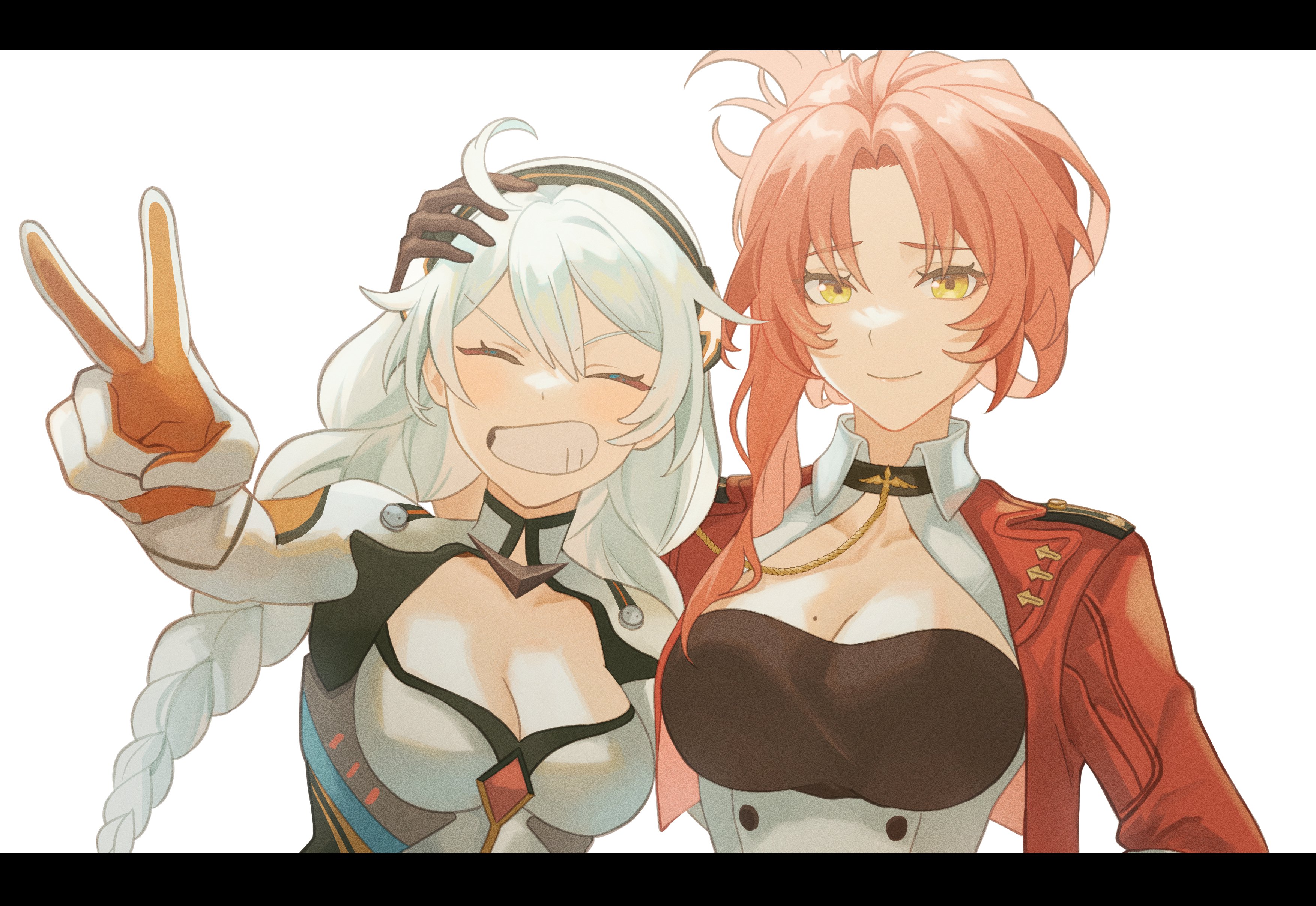 2girls absurdres ahoge bodysuit braid breasts cleavage cleavage_cutout closed_eyes closed_mouth clothing_cutout collarbone commentary gloves hair_between_eyes hand_on_another's_head highres honkai_(series) honkai_impact_3rd jacket kiana_kaslana kiana_kaslana_(white_comet) letterboxed long_hair long_sleeves looking_at_viewer mole mole_on_breast multiple_girls murata_himeko murata_himeko_(battle_storm) open_mouth outstretched_arm red_hair red_jacket simple_background smile teeth upper_body v white_background white_bodysuit white_hair yamabuki0211 yellow_eyes