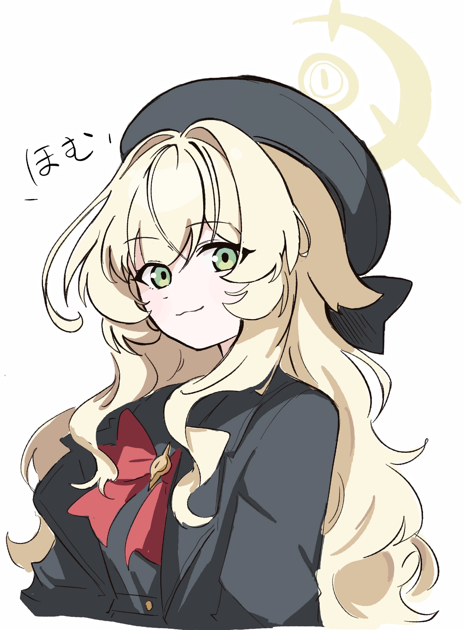 1girl :3 black_hat black_jacket blonde_hair blue_archive bow bowtie green_eyes green_halo halo hat highres jacket professor_niyaniya_(blue_archive) red_bow red_bowtie simple_background solo translation_request upper_body white_background yako2189