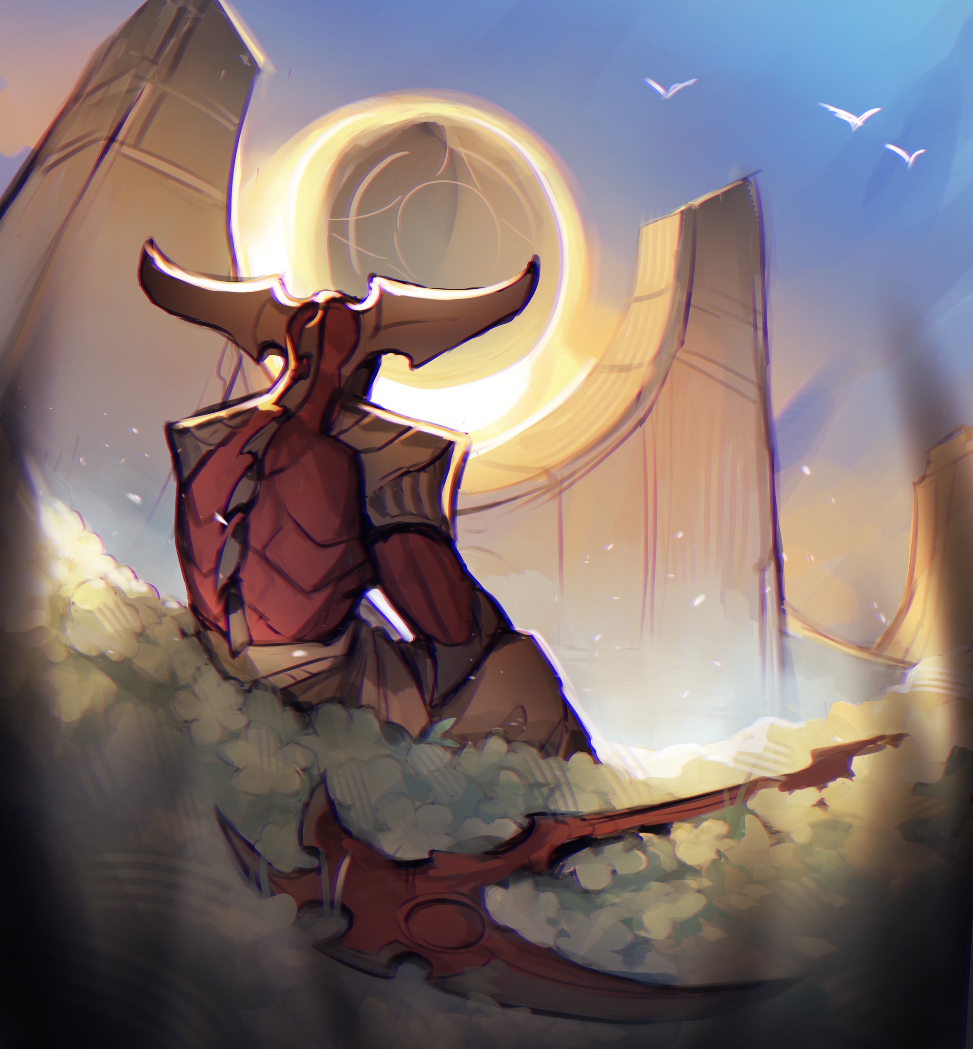 1boy bird bush chromatic_aberration demon demon_horns from_behind highres horns league_of_legends male_focus outdoors rhaast scythe shurima_(league_of_legends) sitting sky solo sudo_(pseudostars) white_bird