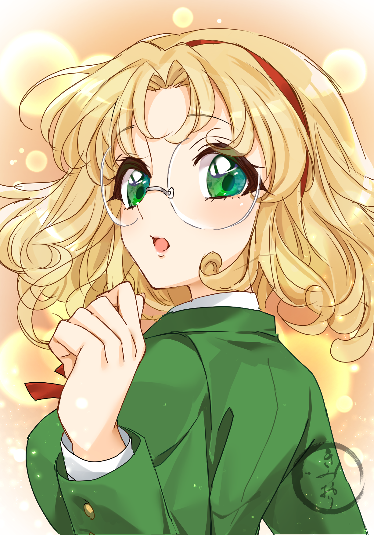 artist_logo blonde_hair glasses green_eyes green_jacket hairband highres hououji_fuu jacket kimiori_(yuapple241) logo looking_afar magic_knight_rayearth medium_hair open_mouth red_hairband round_eyewear shirt upper_body white_shirt