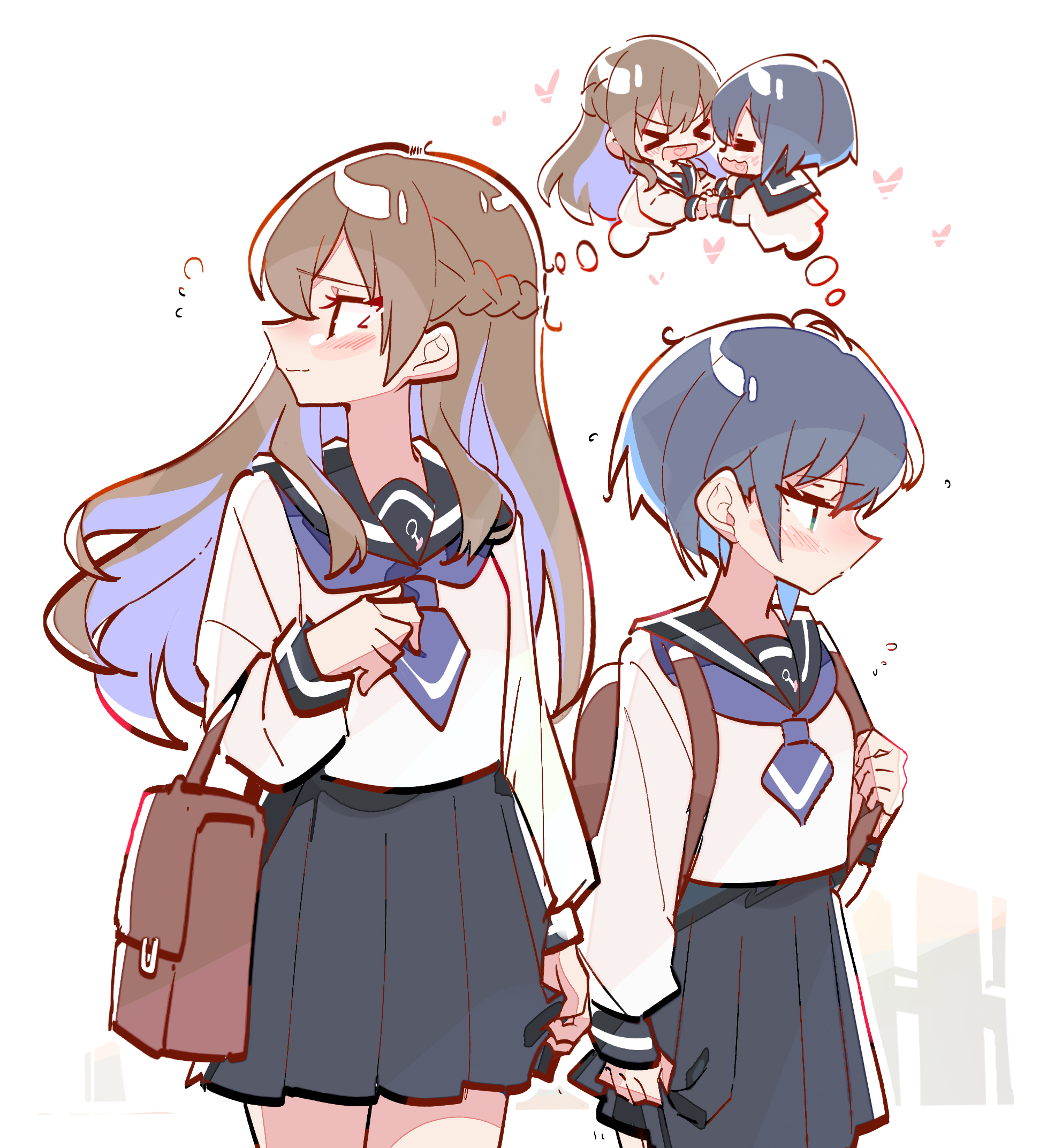 >_< 2girls =_= blue_hair blue_skirt braid briefcase brown_hair clothes_grab cowboy_shot flying_sweatdrops grabbing_another's_skirt half_up_braid heart heart_in_mouth height_difference highres holding_hands holding_own_skirt long_hair long_sleeves looking_to_the_side multicolored_hair multiple_girls na_nare_hana_nare neckerchief obunai_suzuha open_mouth pleated_skirt school_briefcase school_uniform serafuku shared_thought_bubble shirt short_hair skirt speech_bubble tanizaki_shion thought_bubble two-tone_hair wavy_mouth white_shirt yuri zhanzhangzlw