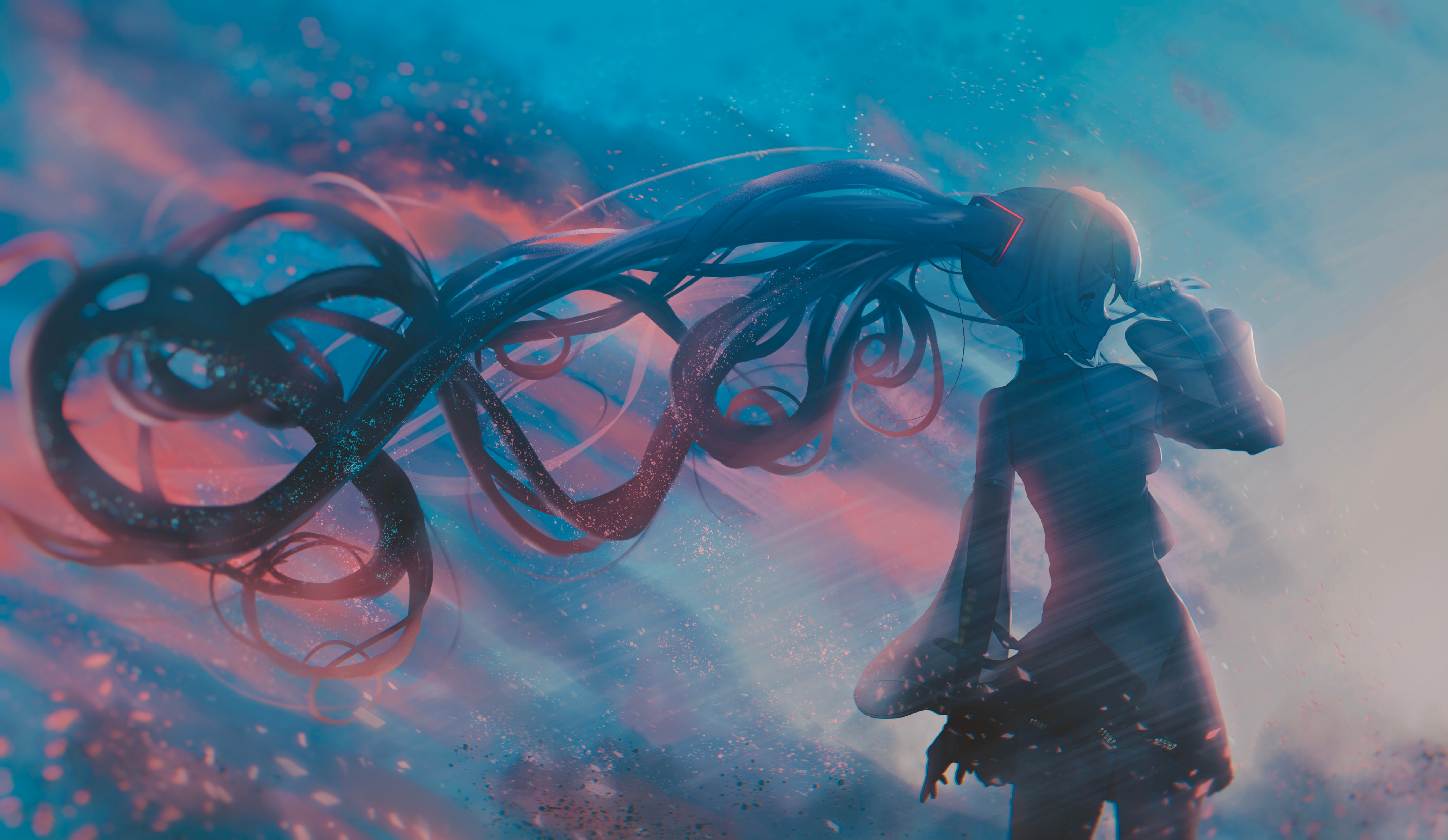 1girl absurdres blue_sky cloud cloudy_sky colorful commentary cowboy_shot day deog3 detached_sleeves floating_hair from_behind hair_ornament hatsune_miku highres long_hair long_sleeves miniskirt outdoors pink_sky shirt skirt sky sleeveless sleeveless_shirt solo standing twintails very_long_hair vocaloid