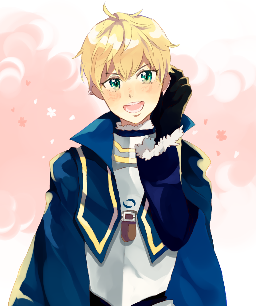 1boy arthur_pendragon_(fate) black_gloves blonde_hair blue_coat coara coat fate/grand_order fate_(series) gloves green_eyes hair_between_eyes long_sleeves looking_at_viewer male_focus open_mouth pink_background short_hair solo upper_body