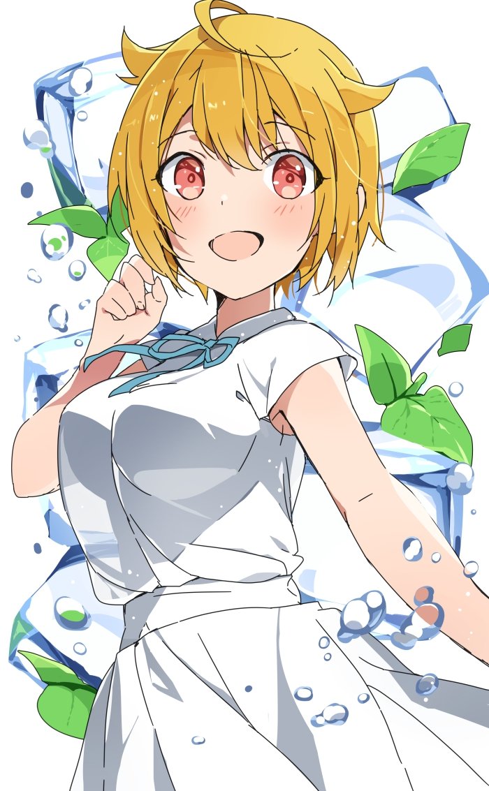 1girl ahoge air_bubble blonde_hair blue_ribbon blush breasts bubble dot_nose dress hair_between_eyes hand_up ibuki_tsubasa ice ice_cube idolmaster idolmaster_million_live! idolmaster_million_live!_theater_days large_breasts looking_at_viewer mint mochigome_(ununquadium) neck_ribbon open_mouth red_eyes ribbon short_hair short_sleeves smile solo white_dress