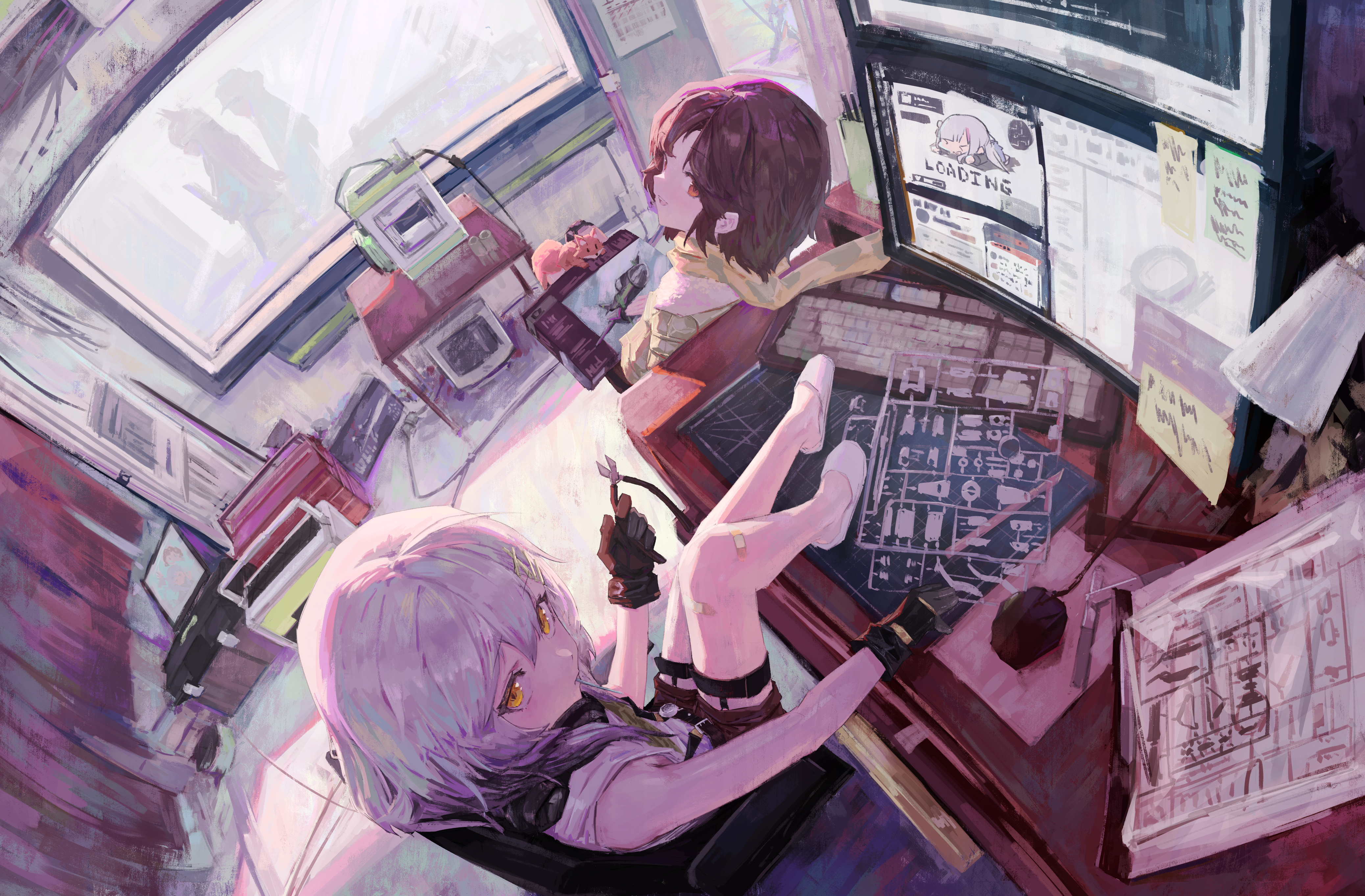 2girls absurdres animal bandaid bandaid_on_knee bandaid_on_leg bow bowtie brown_eyes brown_hair chair commentary computer_keyboard computer_mouse croque_(neural_cloud) desk dutch_angle earhart_(neural_cloud) english_commentary fisheye fox girls'_frontline girls'_frontline_neural_cloud gloves grey_hair highres holding_pliers indoors looking_at_viewer monitor multiple_girls nepperoni on_chair pliers short_hair sitting slippers smile sticky_note white_footwear window yellow_bow yellow_bowtie