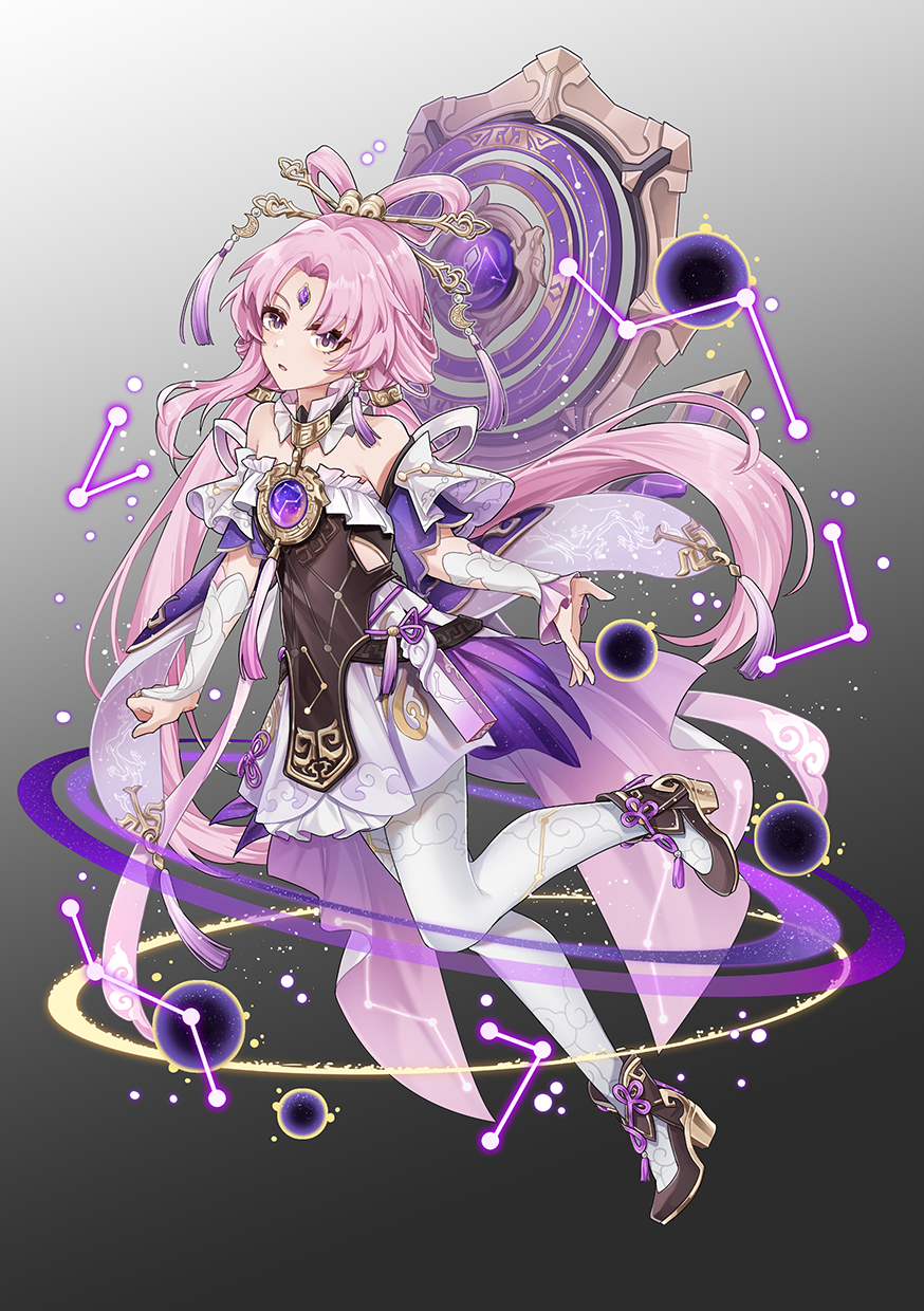 1girl bow-shaped_hair clothing_cutout constellation detached_sleeves dot_nose earrings floating_hair forehead_jewel fu_xuan_(honkai:_star_rail) full_body hair_ornament hairpin highres honkai:_star_rail honkai_(series) jewelry lily030988 long_hair looking_at_viewer low_twintails pantyhose parted_lips pink_hair side_cutout single_earring solo tassel tassel_earrings twintails very_long_hair white_pantyhose yellow_eyes