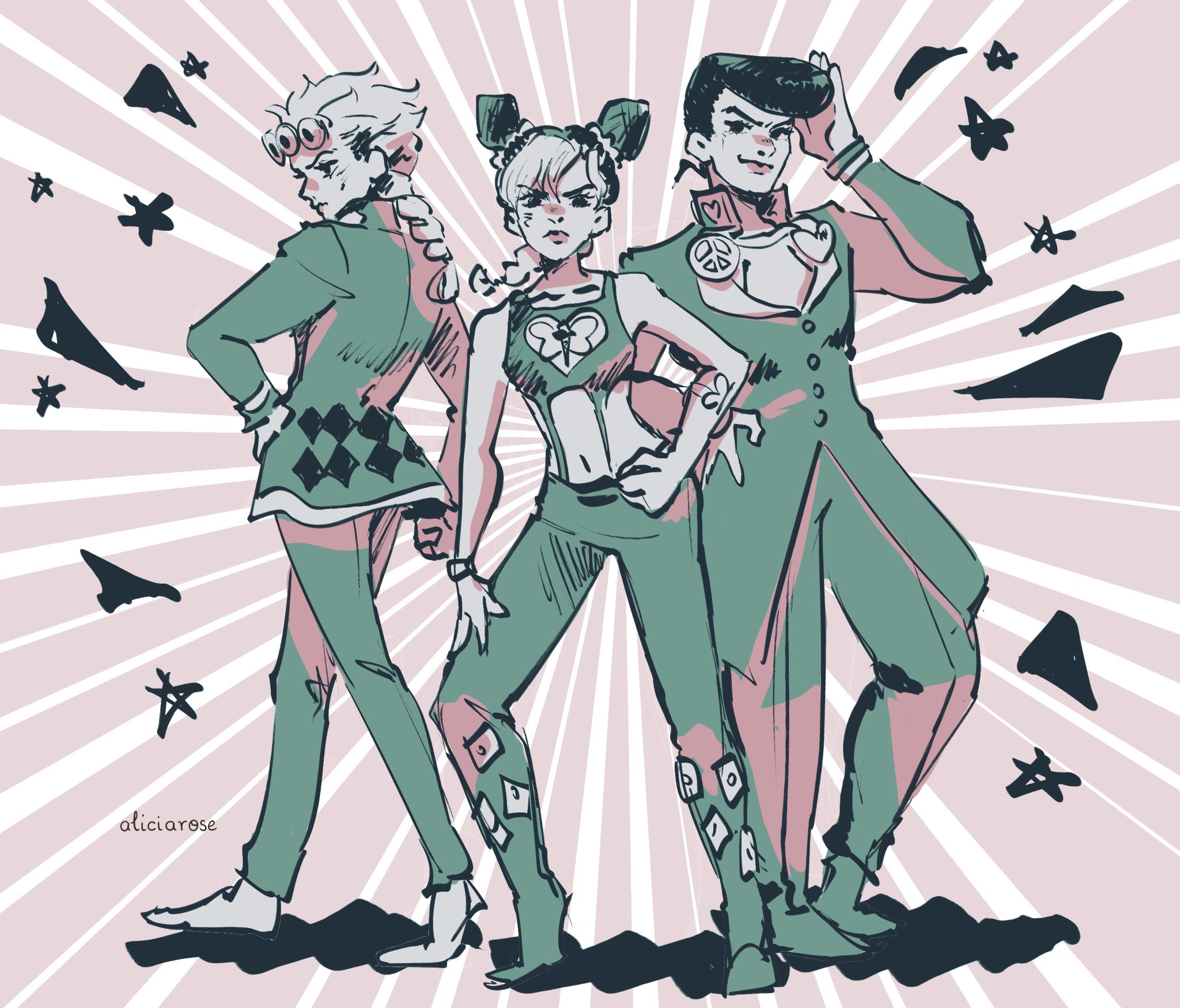 1girl 2boys alicia_rose artist_name braid braided_ponytail bun_with_braided_base closed_mouth commentary diamond_wa_kudakenai double_bun english_commentary full_body gakuran giorno_giovanna hair_bun hand_on_own_hip higashikata_josuke highres jojo_no_kimyou_na_bouken kuujou_jolyne looking_back monochrome multiple_boys pants pompadour school_uniform smile star_(symbol) stone_ocean sunburst sunburst_background vento_aureo