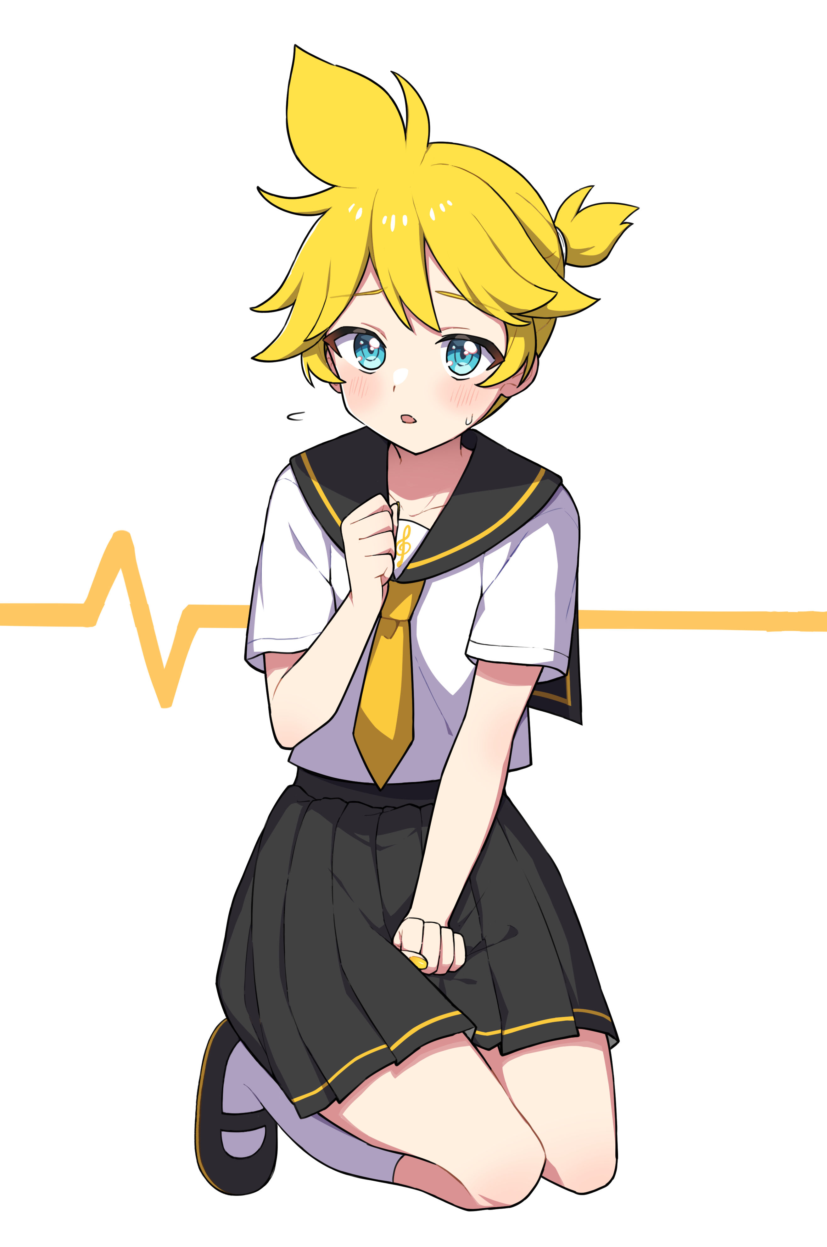 1boy absurdres black_skirt blonde_hair blue_eyes blush clenched_hands commentary cowlick crossdressing crossdressing_(mtf) double-parted_bangs flying_sweatdrops full_body furrowed_brow highres kagamine_len kneehighs mary_janes miz_(mizillustration) necktie pleated_skirt ponytail sailor_collar school_uniform seiza serafuku shoes short_hair short_ponytail shy simple_background sitting skirt skirt_tug socks solo sweatdrop treble_clef vocaloid white_background white_socks yellow_nails yellow_necktie yellow_trim