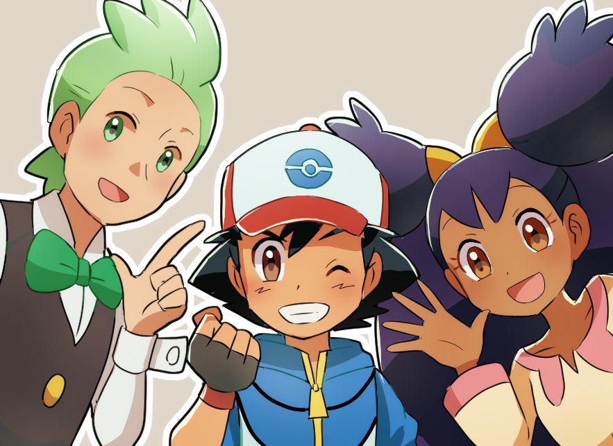 1girl 2boys ash_ketchum black_hair bow bowtie brown_eyes cilan_(pokemon) fingerless_gloves gloves green_eyes green_hair hat iris_(pokemon) long_hair looking_at_viewer multiple_boys nintendo one_eye_closed open_mouth pointing pokemon pokemon_(anime) pokemon_the_series:_black_&_white purple_hair shugara smile twintails very_long_hair wink zipper