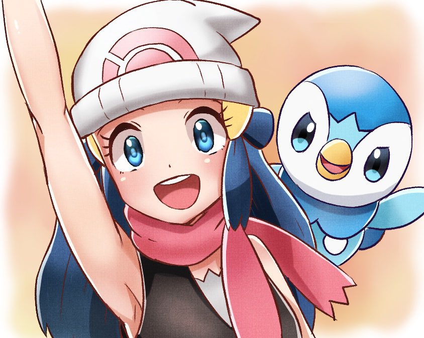 1girl blue_eyes blue_hair dawn_(pokemon) gen_4_pokemon hair_ornament hairclip hat long_hair nintendo open_mouth piplup pokemon pokemon_(anime) pokemon_(creature) pokemon_the_series:_diamond_and_pearl scarf shugara smile