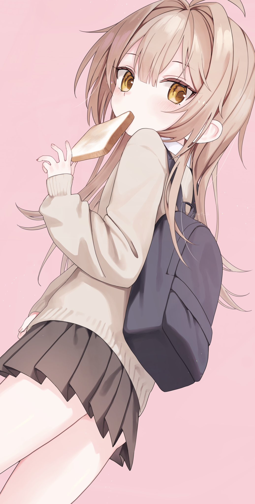 1girl ahoge backpack bag black_bag blunt_bangs blush bread bread_slice brown_cardigan brown_eyes brown_hair cardigan commentary_request cowboy_shot dutch_angle eyelashes food food_in_mouth from_below hair_intakes hand_up highres indie_virtual_youtuber kashuu_(pixiv_66328082) long_hair long_sleeves looking_at_viewer miniskirt mouth_hold pink_background pleated_skirt rurudo_lion school_uniform simple_background skirt sleeves_past_wrists solo toast toast_in_mouth tsurime twitter_username virtual_youtuber