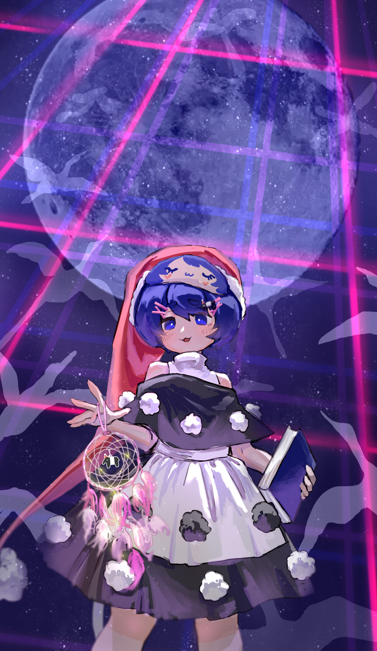 1girl :3 :d absurdres bare_shoulders black_dress blue_eyes blue_hair book chinese_commentary clothing_cutout commentary_request doremy_sweet dreamcatcher dream_world_(touhou) dress feet_out_of_frame hair_ornament hairclip hat highres holding holding_book layered_dress looking_at_viewer moon nightcap open_mouth pom_pom_(clothes) red_hat short_hair shoulder_cutout shouxishao_jiuyuan sleep_mask smile solo touhou turtleneck turtleneck_dress two-tone_dress white_dress