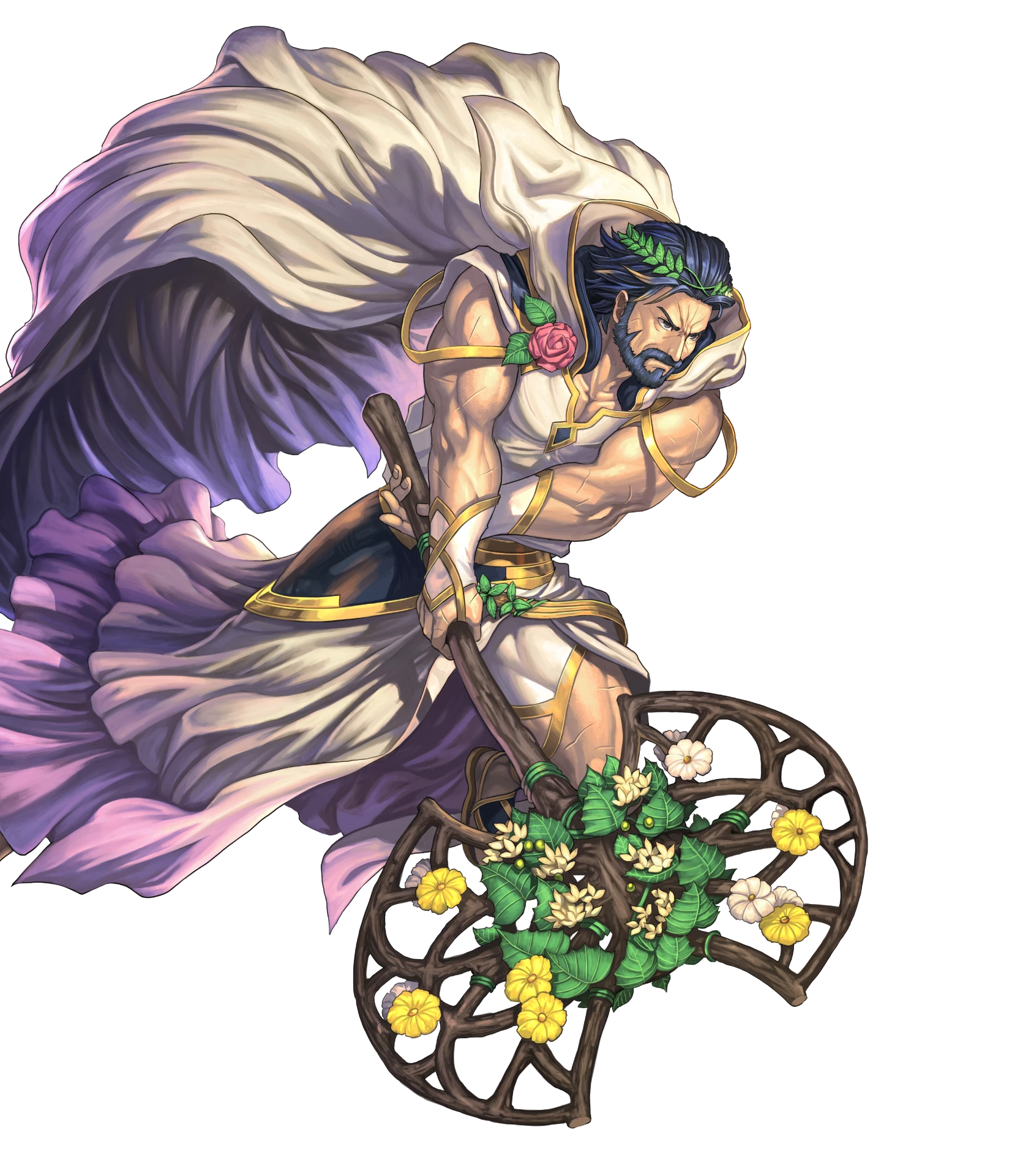 1boy axe beard blue_hair cape facial_hair fighting_stance fire_emblem fire_emblem_heroes flower full_beard full_body gustav_(fire_emblem) gustav_(valentine)_(fire_emblem) highres holding holding_axe holding_weapon izuka_daisuke laurel_crown male_focus mature_male multiple_scars muscular muscular_male nintendo non-web_source official_art sandals scar scar_on_arm scar_on_face transparent_background tunic weapon white_cape white_tunic