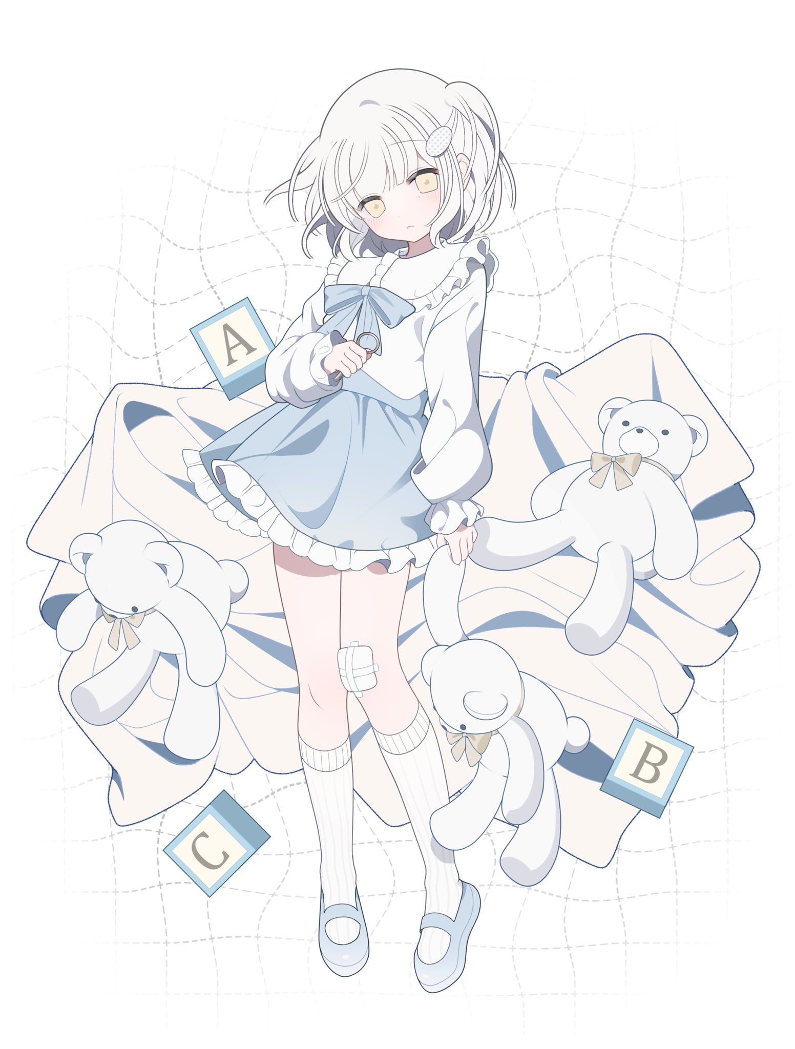 1girl :< arm_at_side blue_bow blue_bowtie blue_shoes blue_skirt blunt_bangs bow bowtie closed_mouth collared_shirt frilled_shirt_collar frilled_skirt frilled_sleeves frills full_body grid_background hair_ornament high-waist_skirt highres holding holding_stuffed_toy kneehighs knees_together_feet_apart kotoruri long_sleeves looking_at_viewer mary_janes medium_hair one_side_up original petticoat puffy_long_sleeves puffy_sleeves shirt shoes simple_background single_eyebrow skirt socks solo standing stuffed_animal stuffed_toy teddy_bear toy_block white_background white_hair white_shirt white_socks yellow_eyes