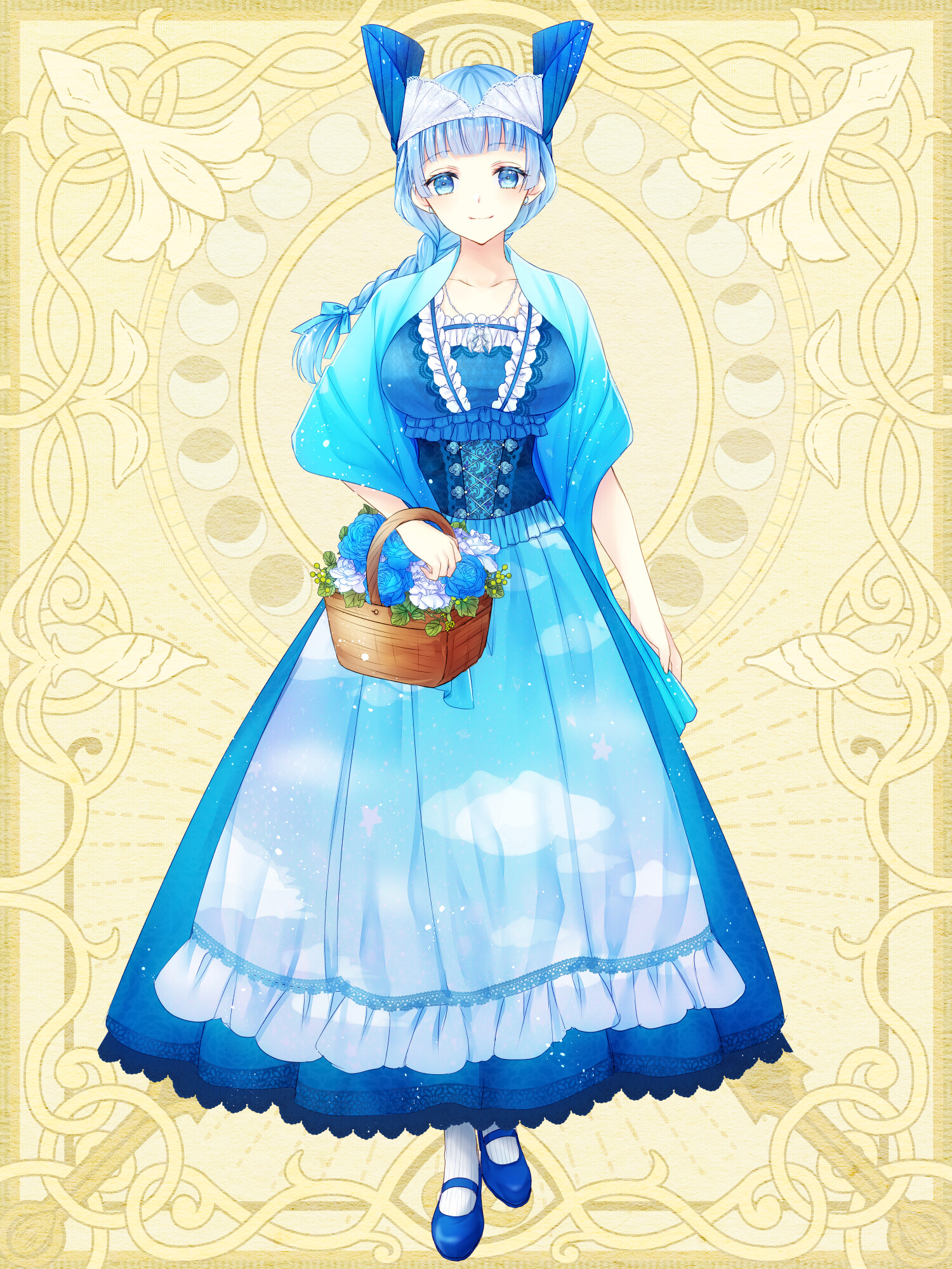 1girl basket blue_dress blue_eyes blue_flower blue_hair blue_shoes braid braided_ponytail breasts chain_paradox cloud_print dress earrings fina_yggdrasil flower frills full_body headpiece highres jewelry light_smile lue_dress mary_janes medium_breasts mizuno_umi necklace shoes socks solo standing stud_earrings white_socks yellow_background