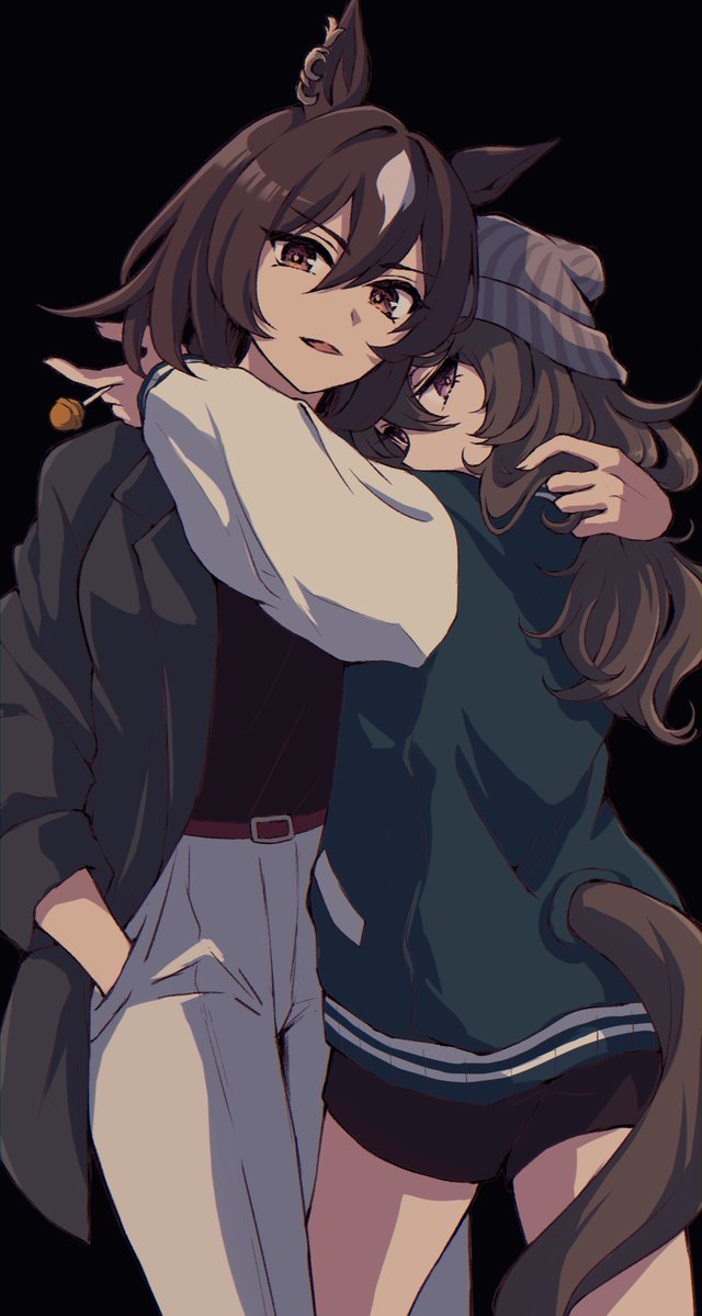 2girls alternate_costume animal_ears arms_around_neck beanie belt black_background black_coat black_hair black_shorts breasts brown_hair candy clothing_cutout coat cowboy_shot food green_jacket grey_hat hair_between_eyes hand_in_another's_hair hand_in_pocket hat holding holding_candy holding_food holding_lollipop horse_ears horse_girl horse_tail jacket letterman_jacket lollipop long_hair long_sleeves looking_at_viewer looking_back medium_breasts multiple_girls nakayama_festa_(umamusume) namuko open_clothes open_coat open_mouth orange_hair pants purple_eyes short_shorts shorts sirius_symboli_(umamusume) standing tail tail_through_clothes umamusume white_pants yuri