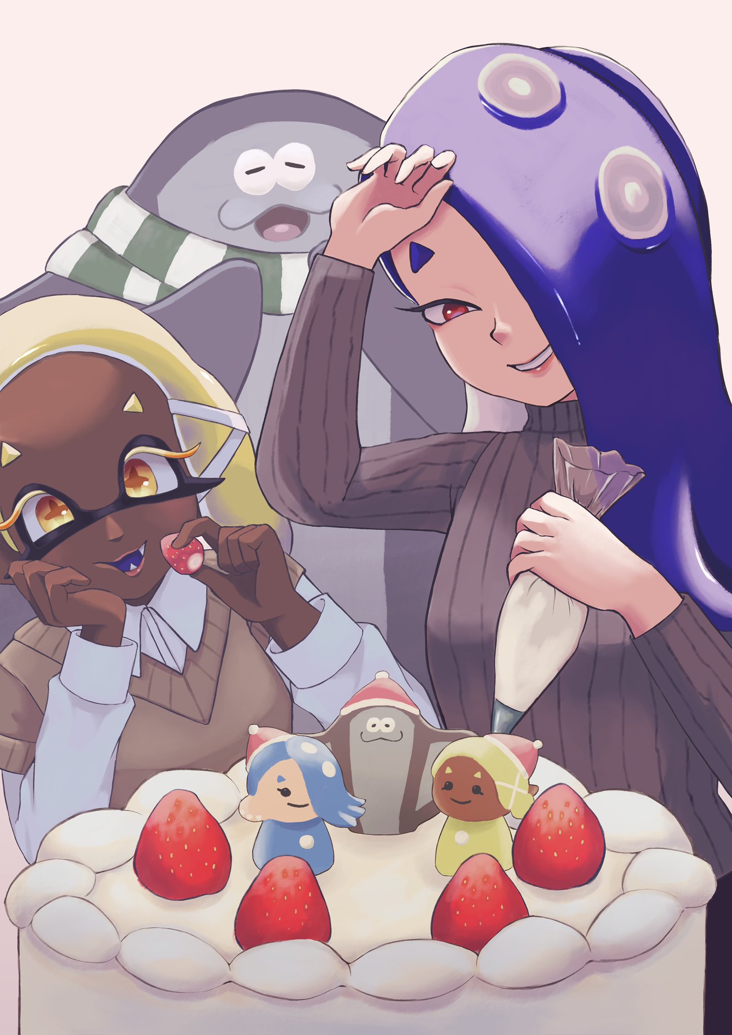 2girls big_man_(splatoon) blonde_hair blue_hair cake cephalopod_eyes colored_eyelashes commentary commentary_request dark-skinned_female dark_skin english_commentary food frye_(splatoon) green_scarf grey_sweater hair_over_one_eye highres holding holding_food inkling long_hair looking_at_viewer mixed-language_commentary multiple_girls nintendo nyu_mame octoling open_mouth pastry_bag red_eyes scarf shiver_(splatoon) short_eyebrows simple_background smile splatoon_(series) splatoon_3 star-shaped_pupils star_(symbol) strawberry_cake striped_clothes striped_scarf sweater symbol-shaped_pupils teeth tentacle_hair thick_eyebrows two-tone_scarf white_background white_scarf yellow_eyes