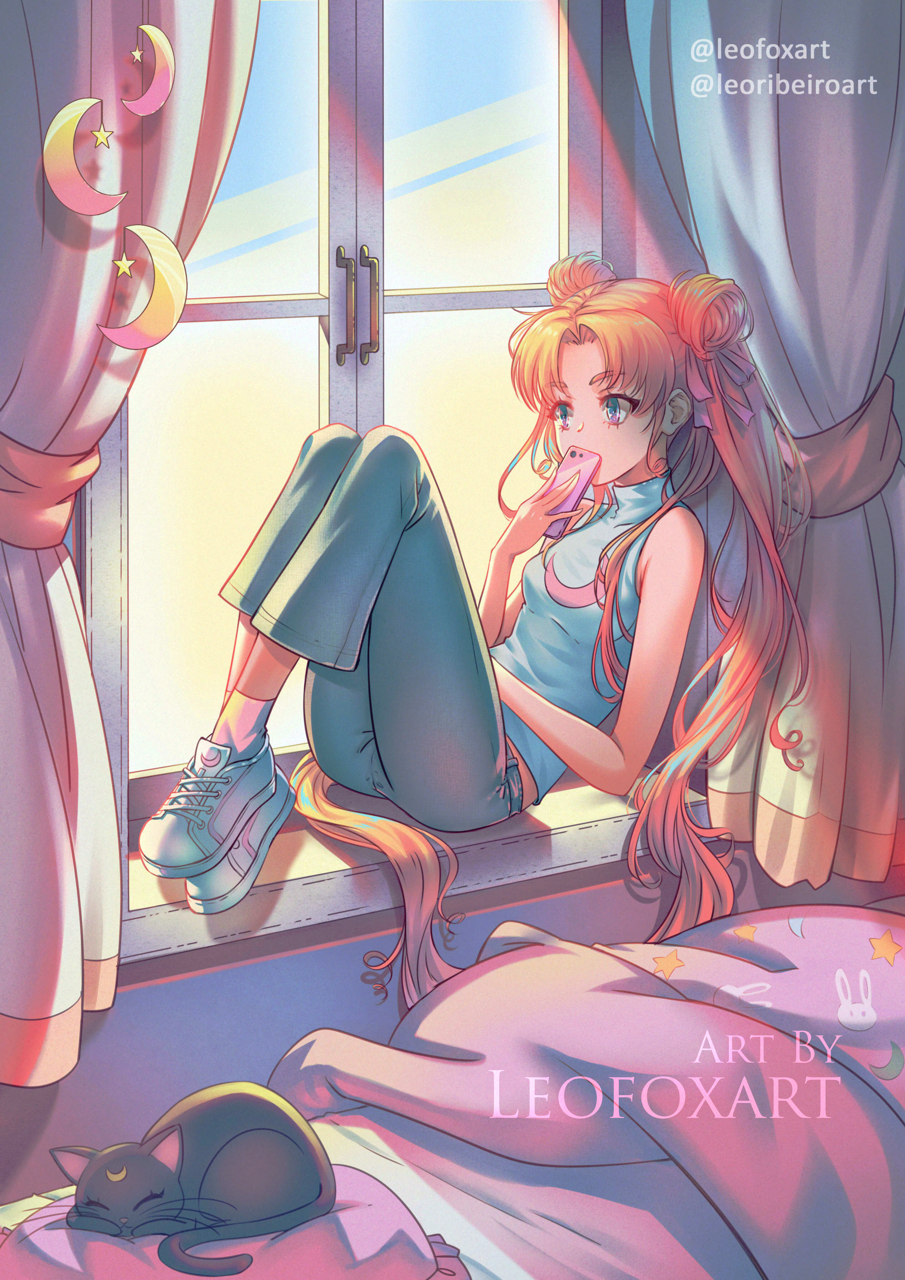 1girl absurdres animal artist_name bare_shoulders bed bishoujo_senshi_sailor_moon bishoujo_senshi_sailor_moon_crystal black_cat blanket blonde_hair blue_eyes blue_pants blue_shirt cat cellphone commentary covering_own_mouth crescent crescent_facial_mark curtains double_bun dusk facial_mark full_body hair_bun highres holding holding_phone leofoxart long_hair looking_to_the_side luna_(sailor_moon) pants phone shirt shoes sitting sitting_in_window sleeping sleeveless sleeveless_shirt smartphone sneakers tsukino_usagi turtleneck turtleneck_shirt twintails very_long_hair white_footwear window