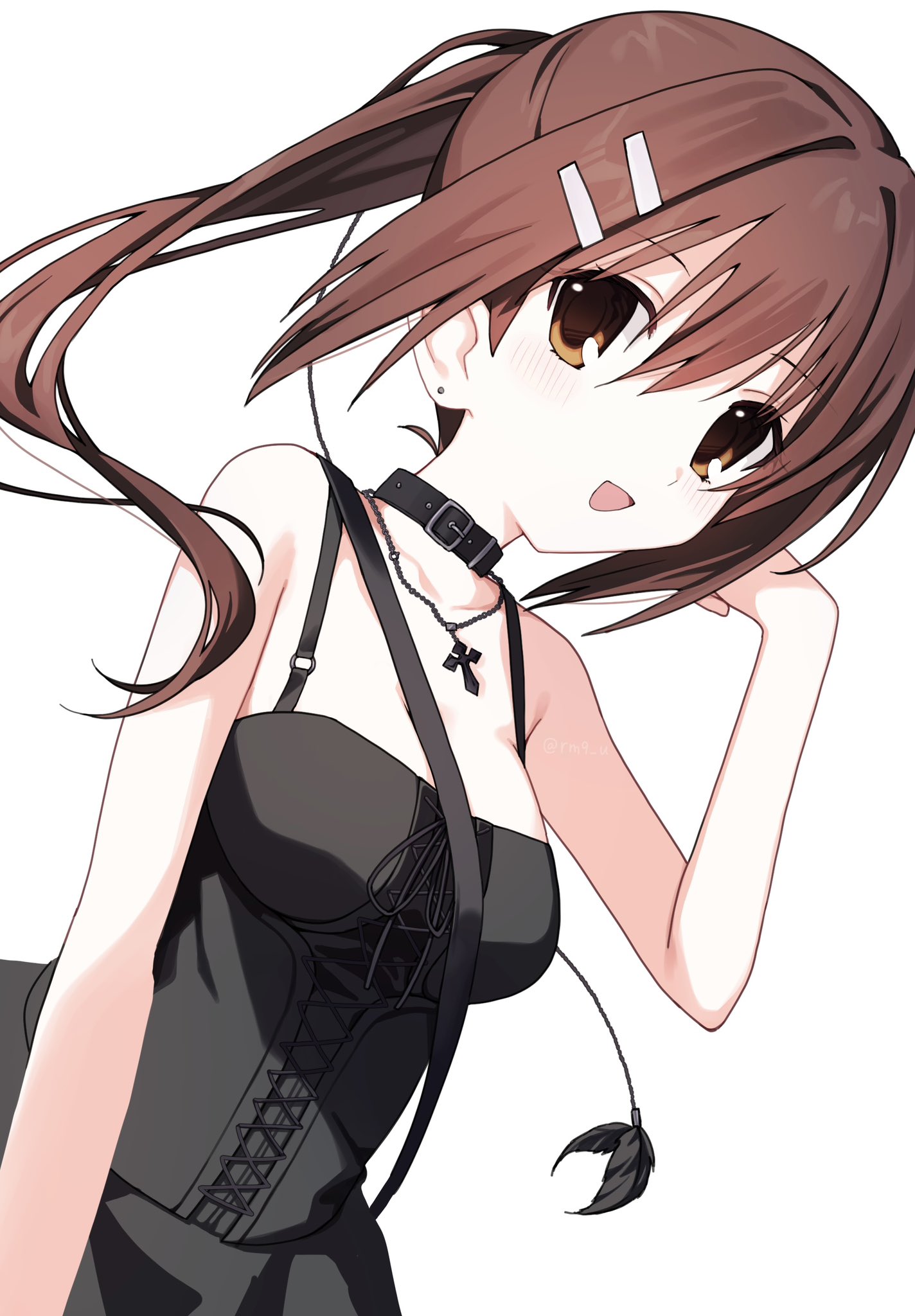1girl :d bare_shoulders belt_collar black_dress blush breasts brown_eyes brown_hair collar cross cross_necklace dress dutch_angle earrings floating_hair hair_between_eyes hair_ornament hairclip hand_up happy highres jewelry kashuu_(pixiv_66328082) long_hair looking_at_viewer medium_breasts minakami_yuki necklace open_mouth ponytail sleeveless sleeveless_dress smile solo spaghetti_strap stud_earrings subarashiki_hibi upper_body