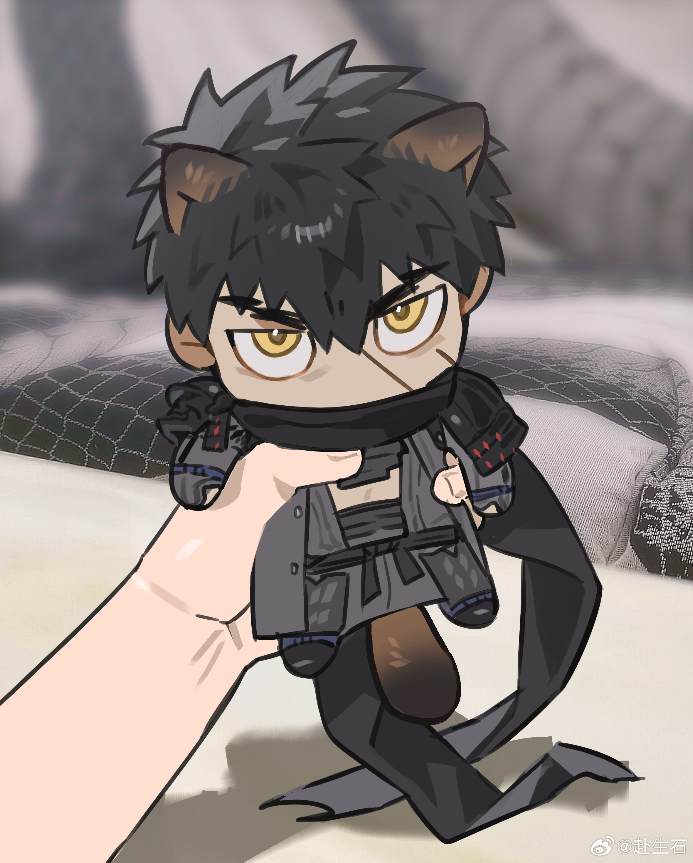 1boy absurdres animal_ears bannriishi black_hair chibi chibi_only covered_mouth deformed doudanuki_masakuni highres kemonomimi_mode looking_at_viewer male_focus photo-referenced photo_background pov pov_hands raccoon_boy raccoon_ears raccoon_tail sanpaku short_hair solo_focus tail touken_ranbu yellow_eyes