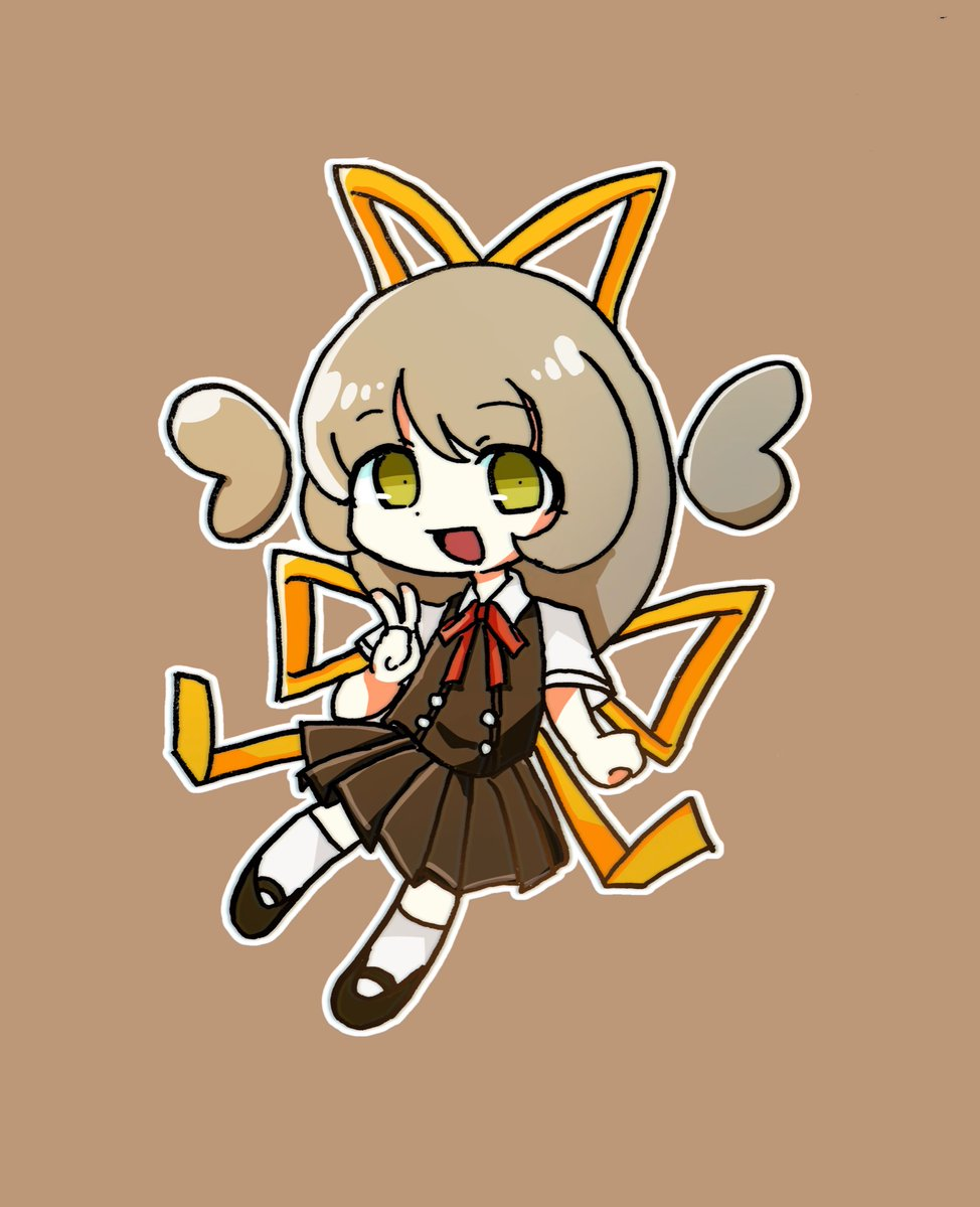 :d bad_id bad_twitter_id black_footwear brown_dress clenched_hand dress grey_hair lasagna_oichizu open_mouth red_ribbon ribbon sakusakusalmon2 short_sleeves simple_background smile socks towelket_wo_mou_ichido v white_socks yellow_eyes yellow_ribbon