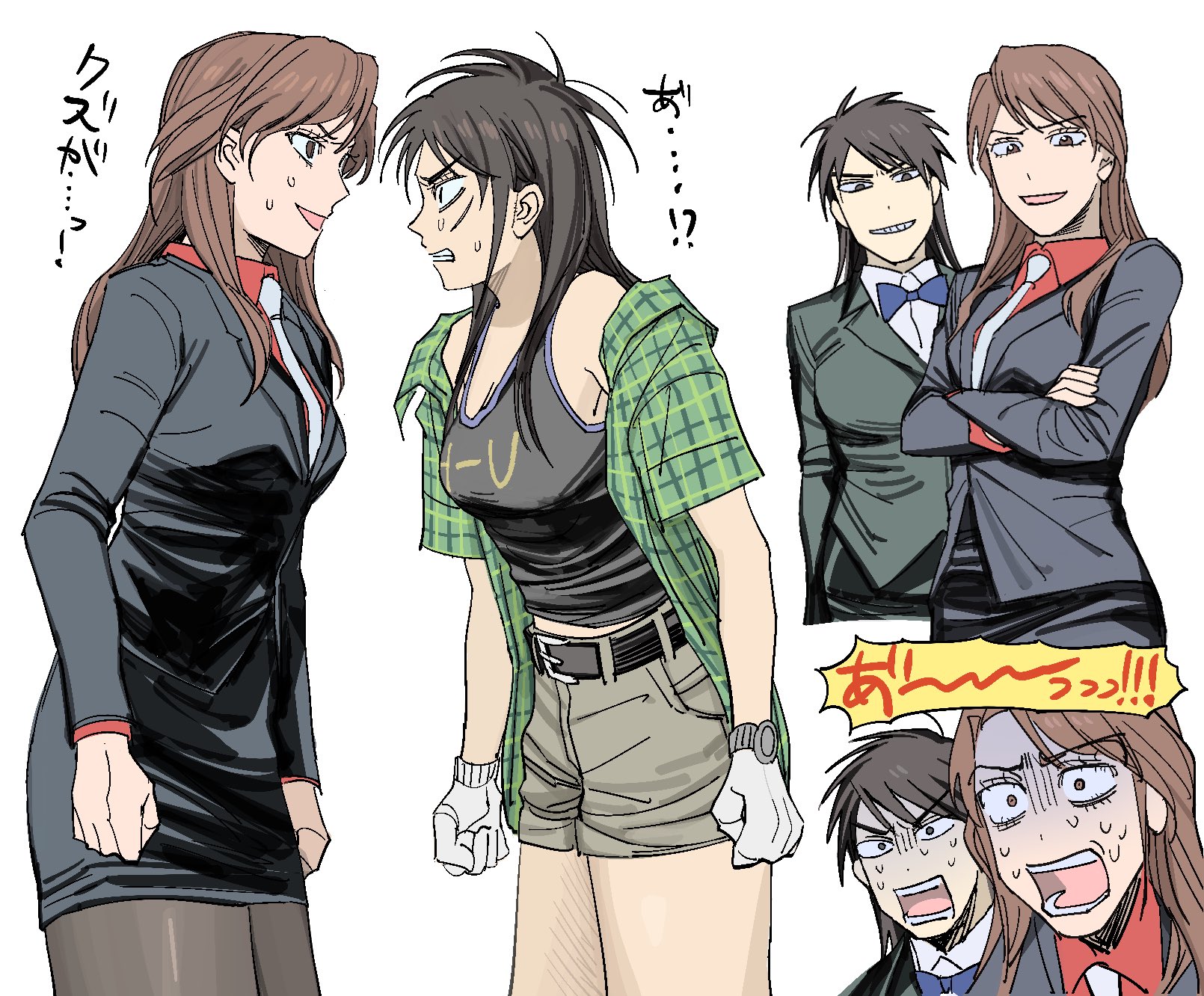 3girls black_hair black_suit bow bowtie breasts brown_hair formal_clothes genderswap genderswap_(mtf) gloom_(expression) highres ichijou_seiya itou_kaiji tobaku_mokushiroku_kaiji large_breasts medium_breasts messy_hair multiple_girls necktie scar scar_on_face shorts simple_background skirt suit sweat tank_top white_background yumei_(jigoku101)