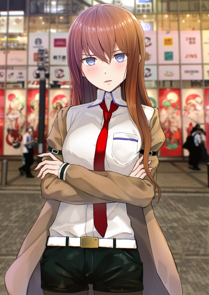 1girl belt black_pantyhose black_shorts blue_eyes blurry blurry_background blush brown_hair brown_jacket crossed_arms highres jacket kanden_sky long_hair long_sleeves looking_at_viewer makise_kurisu necktie pantyhose pantyhose_under_shorts red_necktie science_adventure shorts solo steins;gate