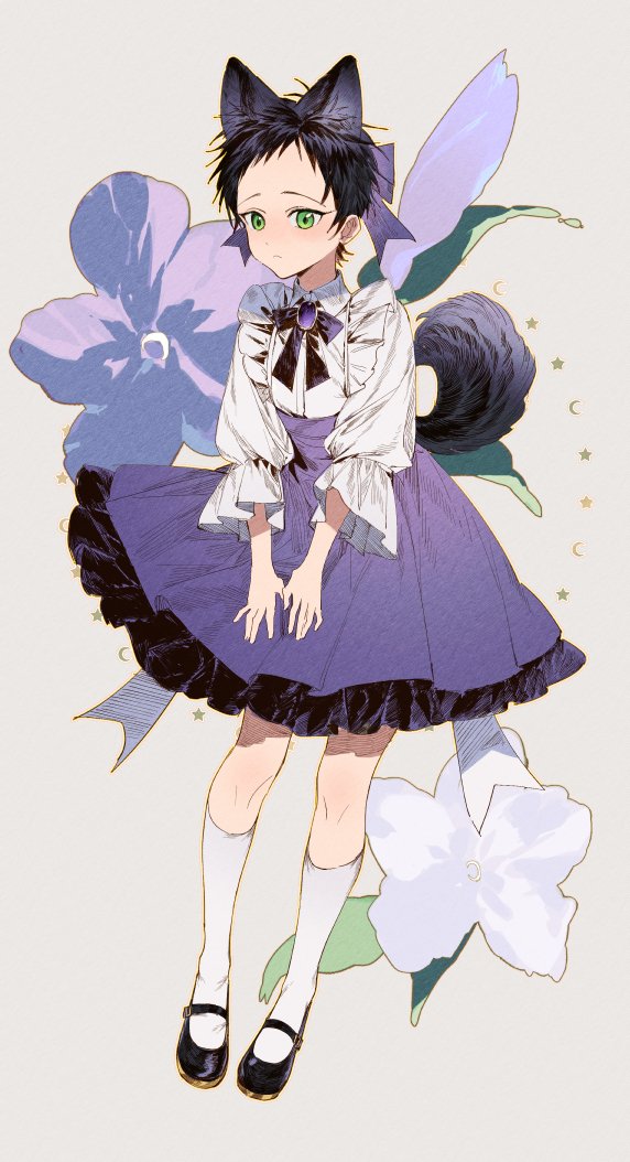 1boy animal_ears black_hair brown_background character_request closed_mouth commentary copyright_request crossdressing crossdressing_(mtf) dog_boy dog_ears dog_tail floral_background flower_request full_body green_eyes kneehighs looking_at_viewer male_focus mary_janes puffy_sleeves purple_skirt shirt shoes short_hair simple_background skirt socks solo standing untranslatable_commentary tail white_shirt yomi4310