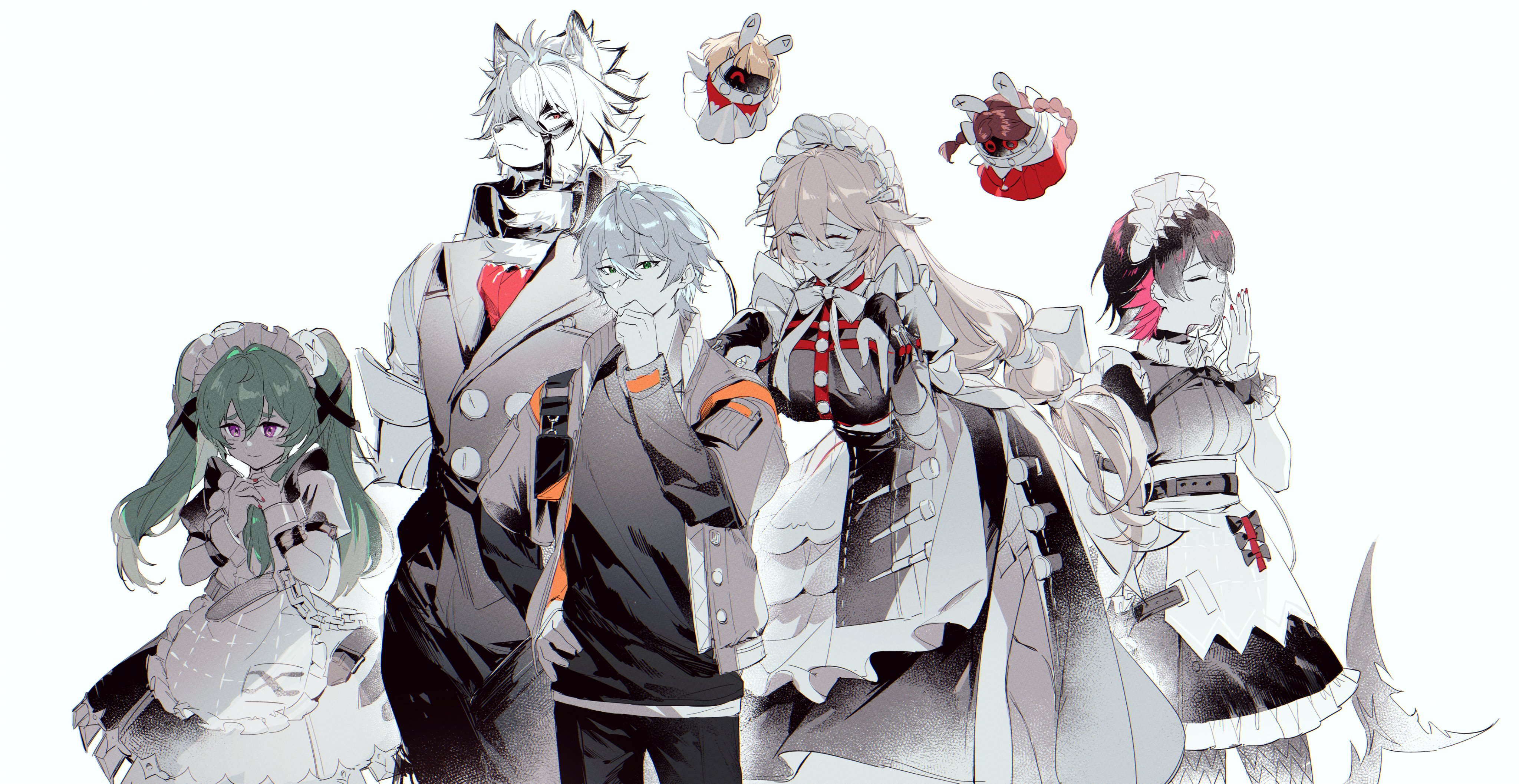 2boys 3girls absurdres alexandrina_sebastiane animal_ear_fluff apron bangboo_(zenless_zone_zero) black_hair black_vest body_fur brown_hair butler chinese_commentary closed_eyes commentary_request corin_wickes cowboy_shot dress ellen_joe fins fish_tail furry furry_male green_hair grey_hair highres jacket light_brown_hair long_hair looking_at_viewer maid maid_apron maid_headdress multiple_boys multiple_girls purple_eyes red_eyes red_hair shark_girl shark_tail short_hair simple_background tail twintails very_long_hair vest von_lycaon white_background white_fur white_hair wise_(zenless_zone_zero) wolf_boy yawning yomi4310 zenless_zone_zero