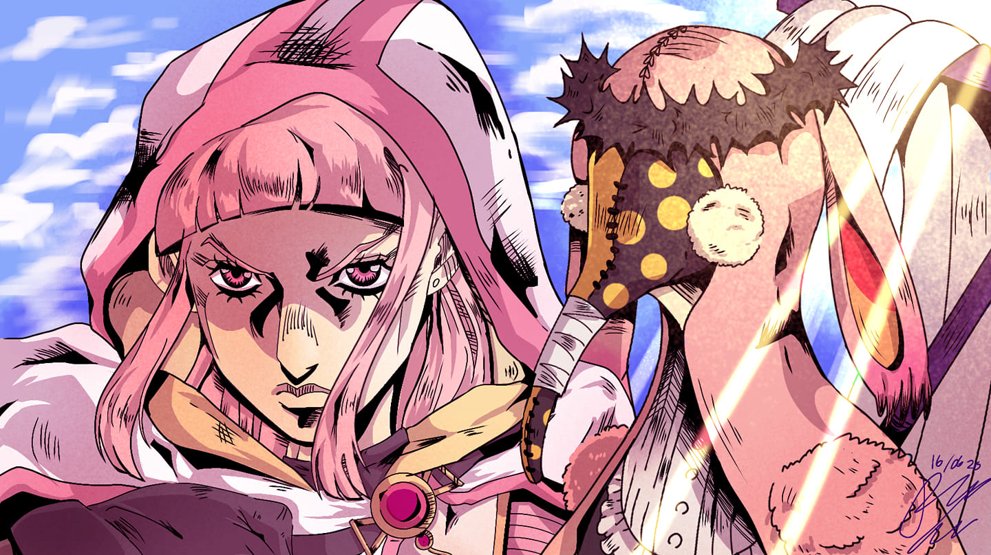 1girl artist_request cape doppel_(madoka_magica) giovanna_(madoka_magica) hood jojo_no_kimyou_na_bouken magia_record:_mahou_shoujo_madoka_magica_gaiden mahou_shoujo_madoka_magica pink_eyes pink_hair source_request tamaki_iroha vento_aureo
