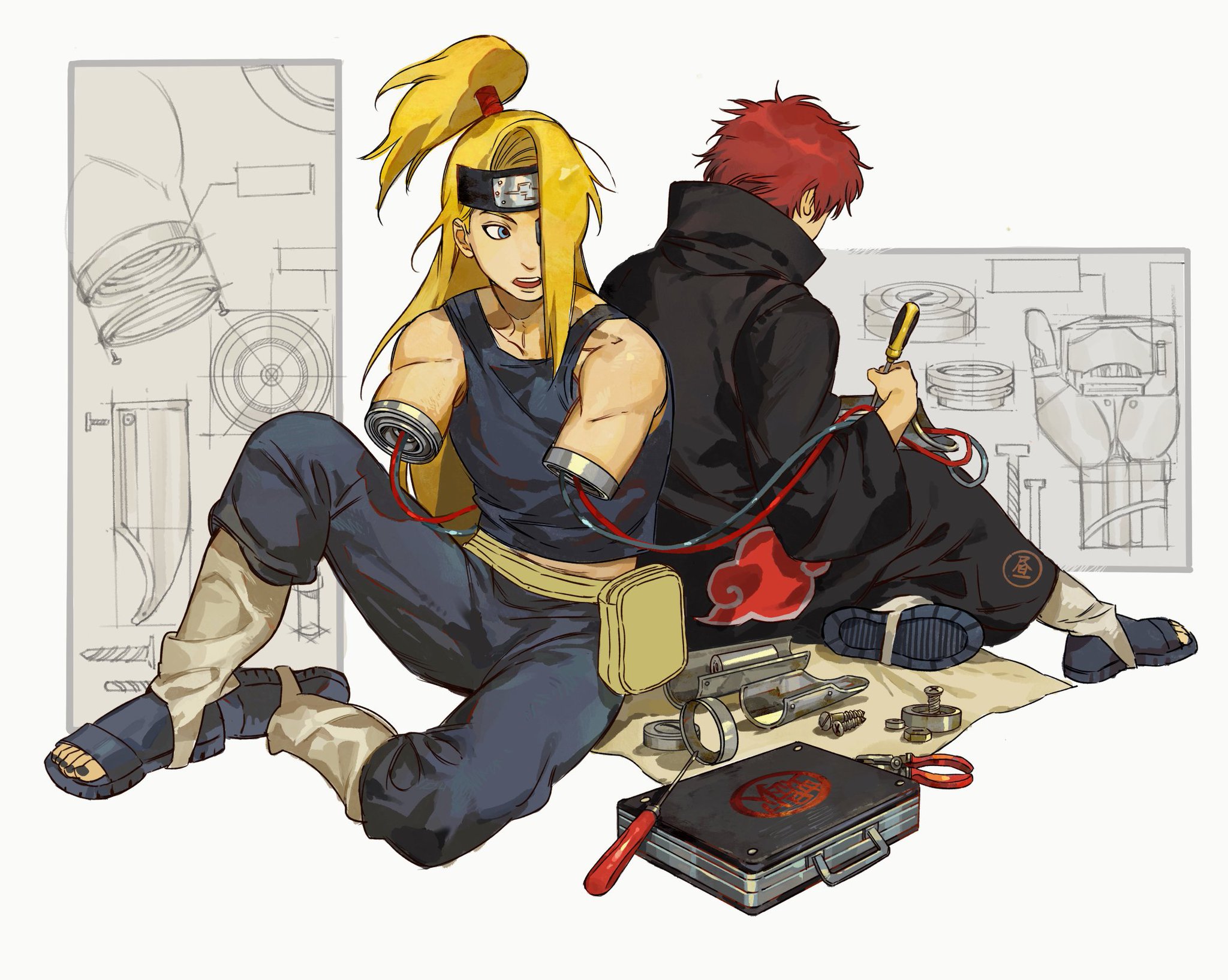 2boys akatsuki_uniform amputee back-to-back bare_shoulders black_pants black_robe black_tank_top blonde_hair blueprint_(object) deidara_(naruto) double_amputee forehead_protector hair_over_one_eye high_ponytail highres holding holding_screwdriver knee_up leg_warmers long_hair male_focus mechabare multiple_boys nail_polish naruto_(series) naruto_shippuuden open_mouth pants pliers ponytail red_hair robe sandals sansanpai sasori_(naruto) screwdriver sitting tank_top teeth upper_teeth_only white_background white_leg_warmers wire