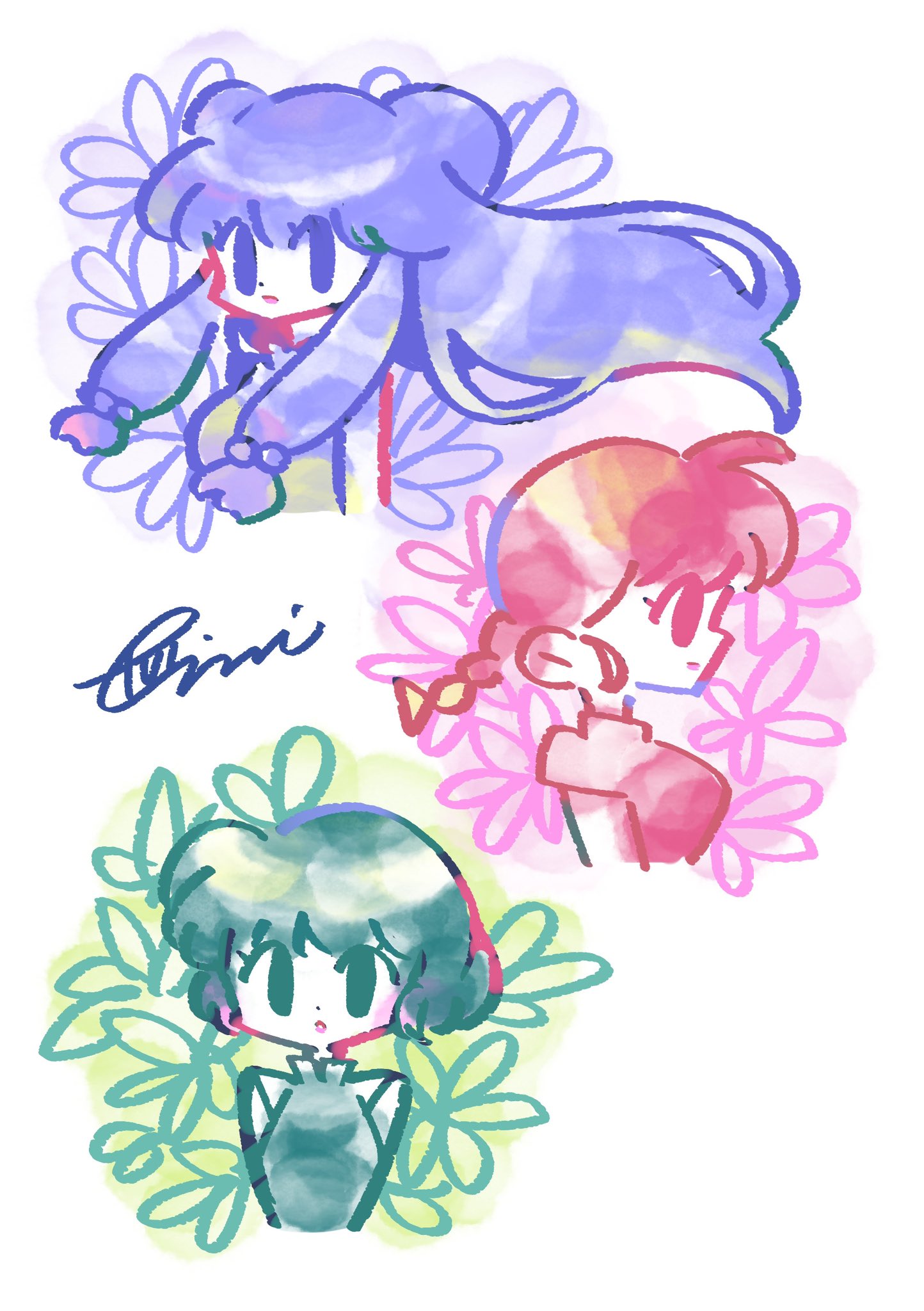 3girls braid commentary double_bun fuziemi green_hair hair_bun hashtag-only_commentary highres long_hair looking_at_viewer looking_to_the_side multiple_girls profile purple_hair ranma-chan ranma_1/2 red_hair shampoo_(ranma_1/2) short_hair sidelocks signature tendou_akane