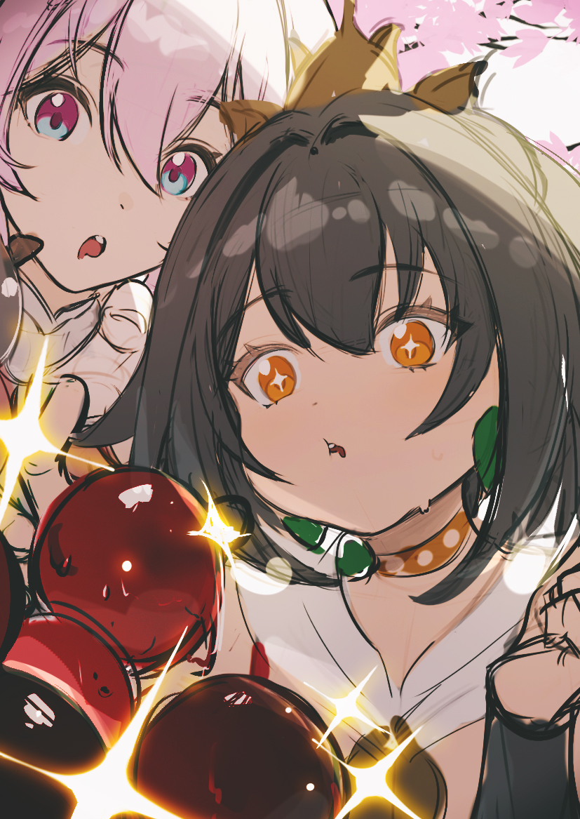 +_+ 2girls blue_eyes cherry_blossoms chewing chinese_clothes choker close-up detached_collar drooling earrings eating food grey_hair hair_between_eyes hands_up holding holding_food honkai:_star_rail honkai_(series) jewelry long_hair looking_at_viewer march_7th_(honkai:_star_rail) march_7th_(hunt)_(honkai:_star_rail) mouth_drool multicolored_eyes multiple_girls open_mouth orange_eyes outdoors pendant pink_hair purple_eyes sketch sparkle teeth tree two-tone_eyes upper_teeth_only white_background yunli_(honkai:_star_rail) zhiyan_li