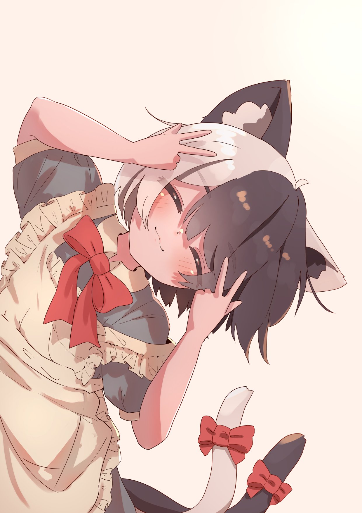 1girl :3 animal_ear_fluff animal_ears apron arms_up bow bowtie cat_ears cat_girl closed_eyes closed_mouth dress frilled_apron frills grey_dress highres kotatsune multicolored_hair multiple_tails original red_bow red_bowtie short_sleeves simple_background solo streaked_hair tail tail_bow tail_ornament two_tails v w white_apron white_background