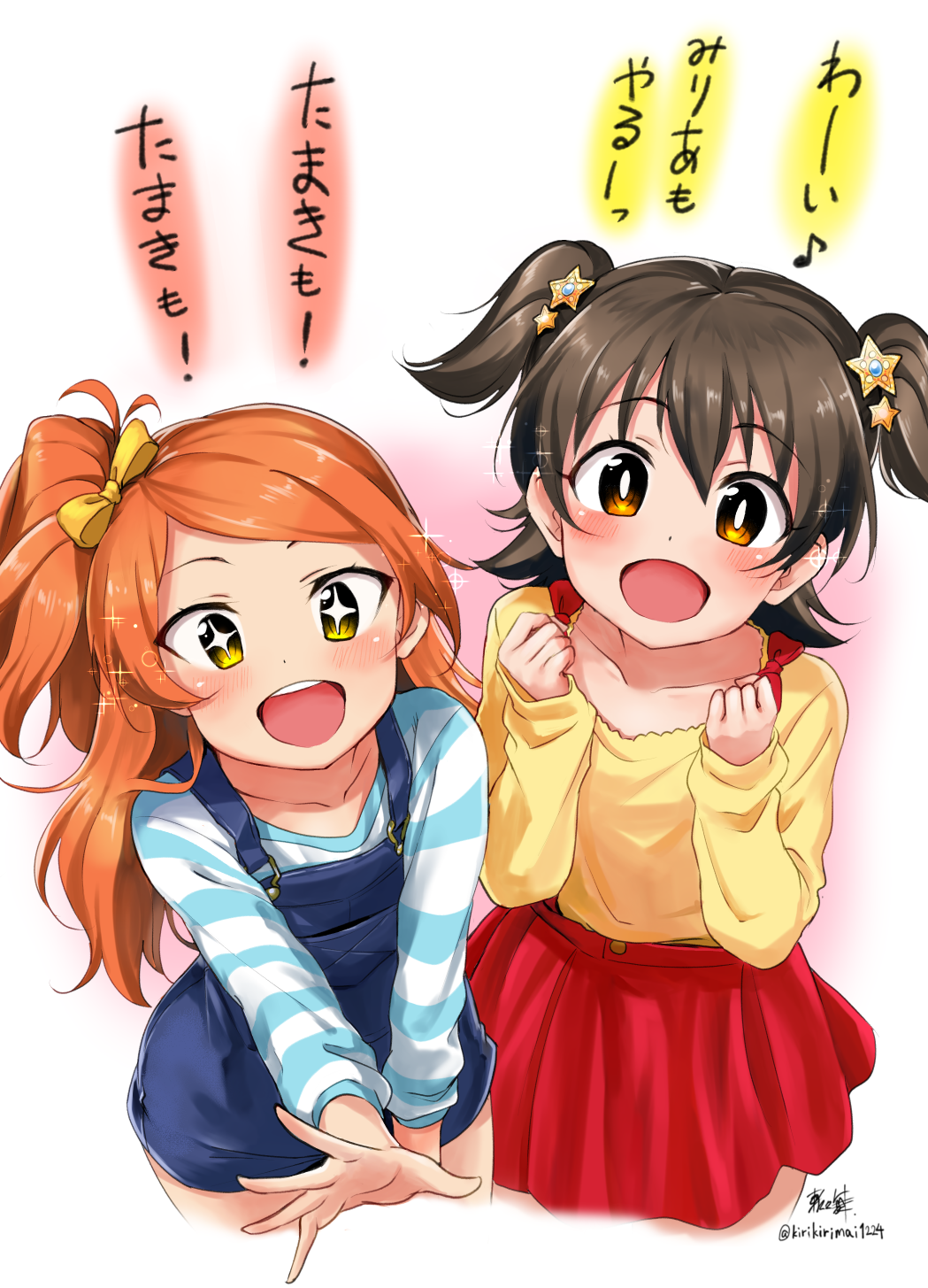 +_+ 2girls ahoge akagi_miria black_hair blue_overalls blue_shirt blush bow breasts brown_eyes clenched_hands collarbone cropped_legs dot_nose hair_bow hair_ornament hair_ribbon hands_up highres idolmaster idolmaster_cinderella_girls idolmaster_cinderella_girls_starlight_stage idolmaster_million_live! idolmaster_million_live!_theater_days jojifuku kirikirimai_(kkm) long_hair long_sleeves looking_at_viewer multiple_girls ogami_tamaki one_side_up open_hand open_mouth orange_hair overalls pink_background pleated_skirt reaching reaching_towards_viewer red_skirt ribbon shirt short_hair signature skirt small_breasts smile sparkle star_(symbol) star_hair_ornament striped_clothes striped_shirt teeth twitter_username two_side_up upper_teeth_only yellow_eyes yellow_ribbon yellow_shirt