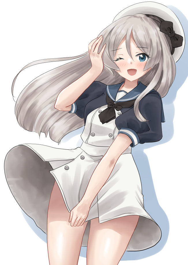 1girl black_jacket black_neckerchief blue_eyes blue_sailor_collar dress dress_tug feet_out_of_frame grey_hair hat holding_own_dress jacket javelin_(kancolle) kantai_collection kitagawa_mikio long_hair looking_at_viewer loose_hair_strand neckerchief one_eye_closed sailor_collar sailor_dress sailor_hat short_sleeves simple_background smile solo white_background white_dress white_hat