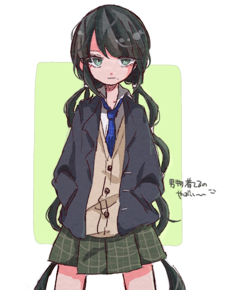 1girl black_hair blazer blue_jacket blue_necktie blunt_bangs brown_vest buttons chabashira_tenko closed_mouth collarbone collared_jacket collared_shirt commentary_request cowboy_shot danganronpa_(series) danganronpa_v3:_killing_harmony expressionless eyelashes green_background green_eyes green_skirt hands_in_pockets hiyomikun jacket lapels long_hair long_sleeves looking_at_viewer low_twintails miniskirt mole mole_under_mouth necktie notched_lapels official_alternate_costume plaid_clothes plaid_necktie pleated_skirt school_uniform shirt skirt solo translated twintails two-tone_background v-neck very_long_hair vest white_background white_shirt