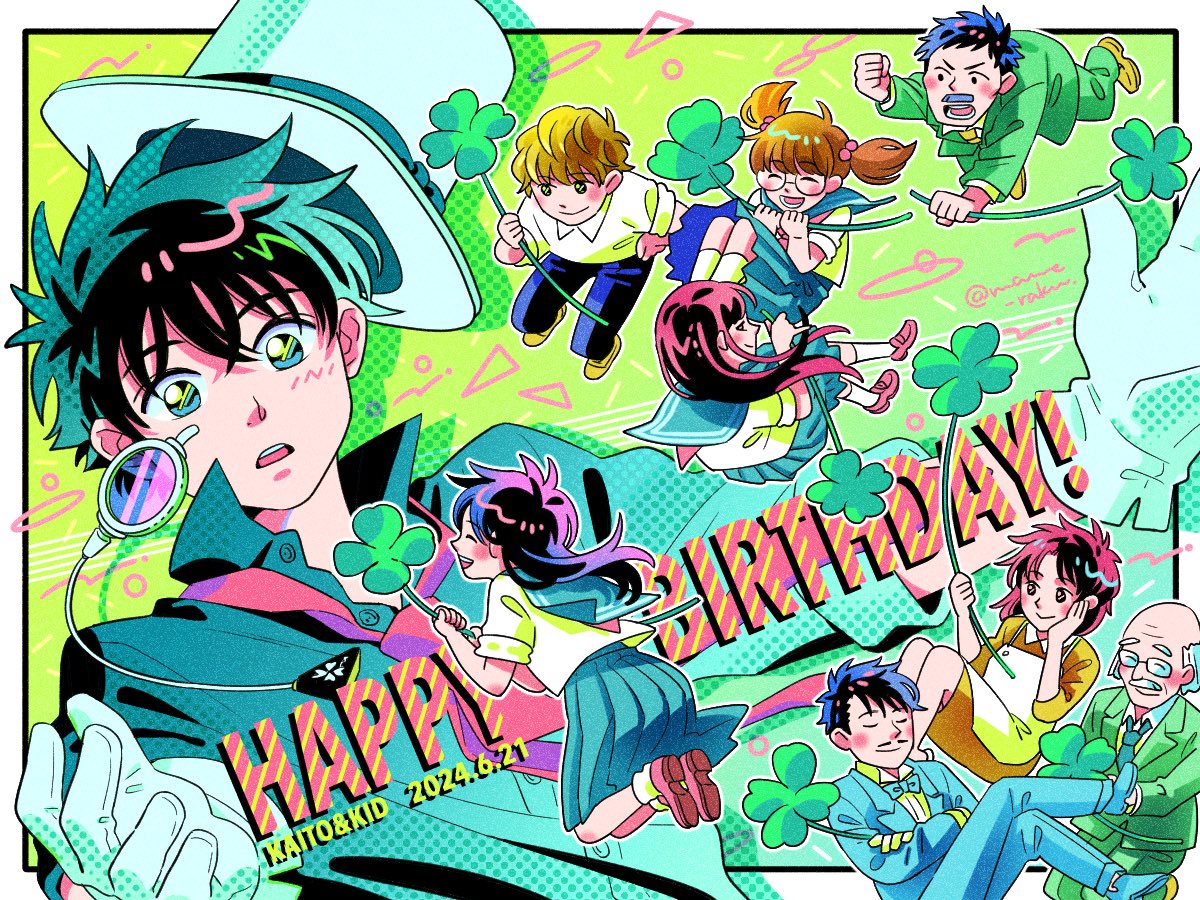 2024 4girls 5boys balding birthday black_hair blonde_hair blue_eyes border brown_hair closed_eyes clover commentary_request dated english_text facial_hair father_and_child father_and_daughter father_and_son floating floating_clothes four-leaf_clover glasses gloves grey_hair hakuba_saguru hat holding holding_clover husband_and_wife jii_kounosuke kaitou_kid koizumi_akako kuroba_chikage kuroba_kaito kuroba_touichi long_hair looking_at_another looking_down magic_kaito maro_mayuge momoi_keiko_(magic_kaito) monocle monocle_chain mother_and_child mother_and_son multiple_boys multiple_girls mustache nakamori_aoko nakamori_ginzo necktie open_mouth parent_and_child pink_necktie pleated_skirt red_hair school_uniform short_hair signature skirt smile top_hat twintails unworn_eyewear white_border white_gloves