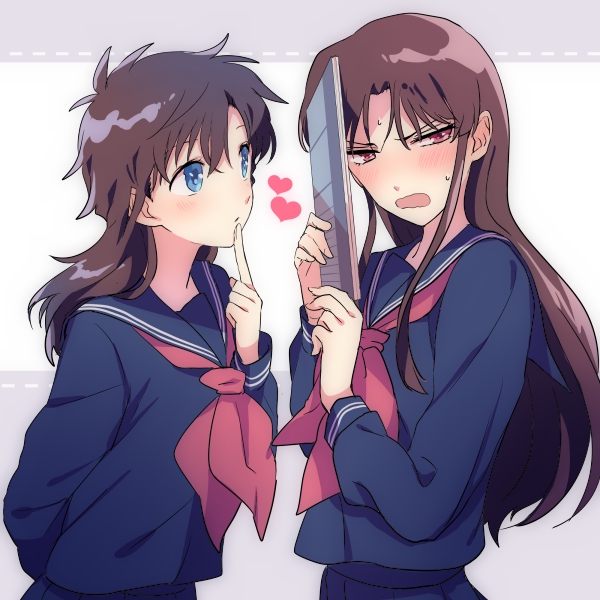 2girls akiyoshi_(tama-pete) averting_eyes blue_eyes blush book brown_hair commentary_request couple covering_face curious finger_to_own_chin heart holding holding_book koizumi_akako long_hair looking_at_another looking_to_the_side magic_kaito medium_hair multiple_girls nakamori_aoko nervous open_mouth partial_commentary red_eyes sailor_collar sailor_shirt school_uniform shirt sweat yuri