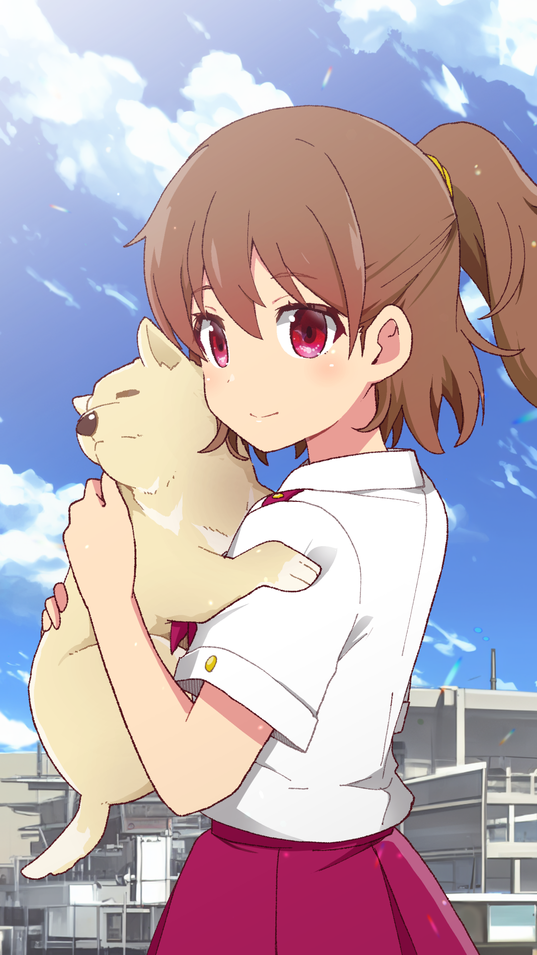 1girl akasaka_miyuki animal brown_hair day dog from_side half_updo highres higurashi_no_naku_koro_ni holding holding_animal looking_back outdoors pink_eyes short_hair short_sleeves skirt sky smile solo tonogai_yoshiki