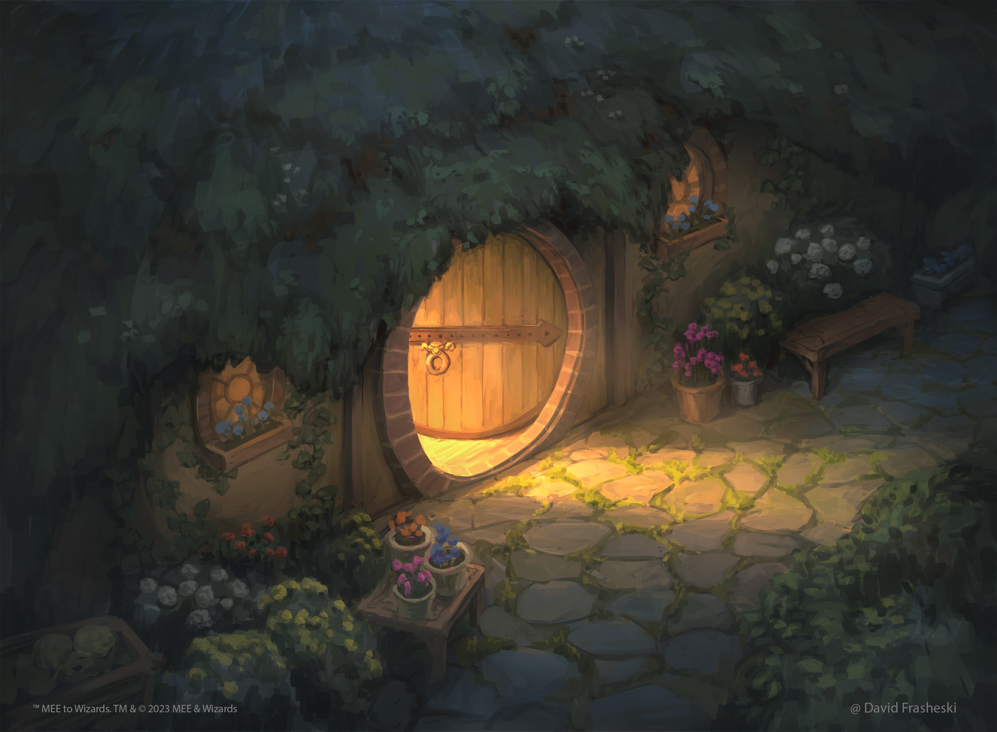 absurdres artist_name bush commentary davidfrasheski door doorway english_commentary english_text flower highres house magic:_the_gathering night no_humans outdoors pink_flower shire stone_floor the_lord_of_the_rings tolkien's_legendarium yellow_flower