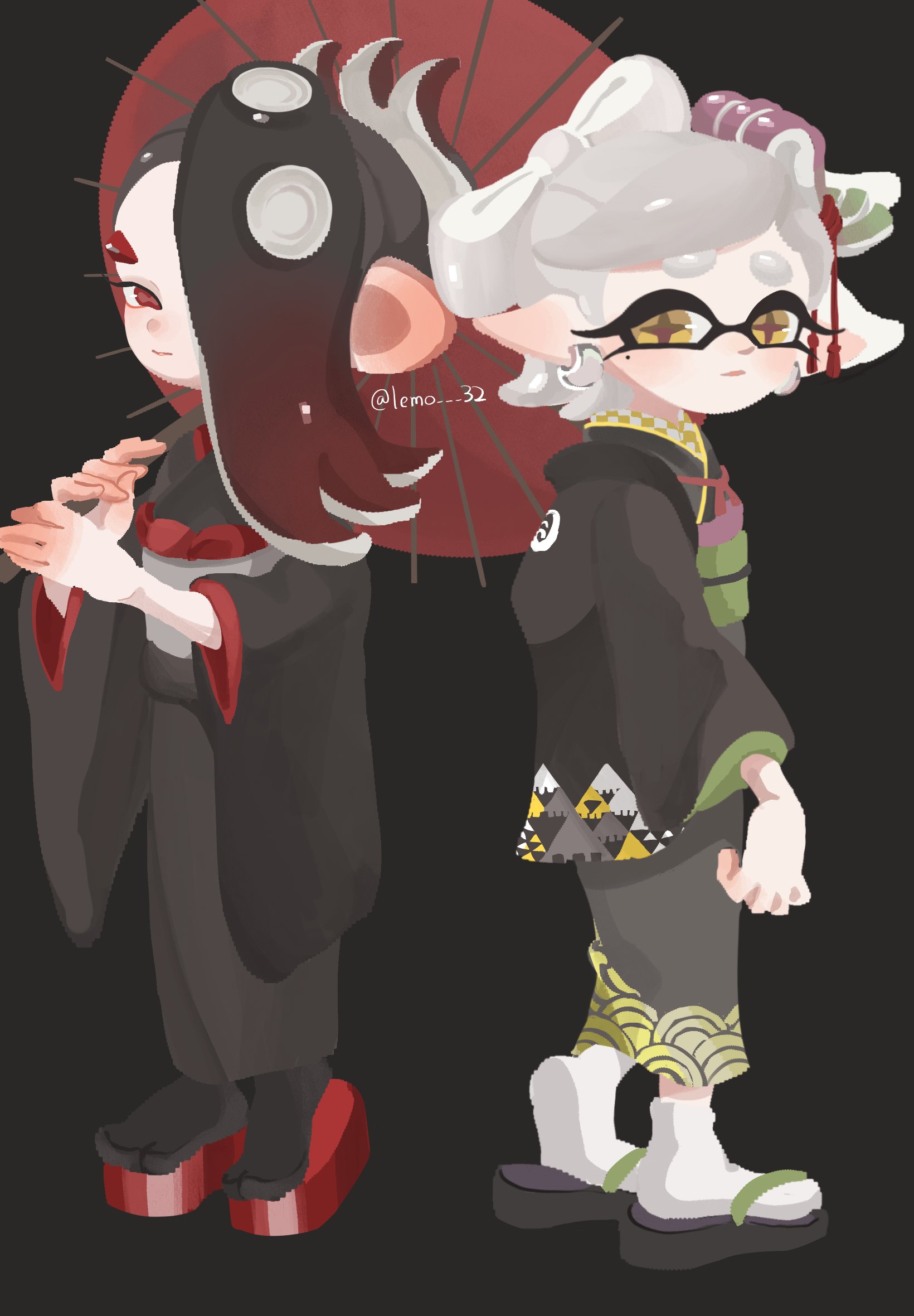 2girls black_background black_hair black_kimono black_socks bow-shaped_hair cephalopod_eyes closed_mouth gradient_hair grey_hair hair_over_one_eye highres holding holding_umbrella inkling japanese_clothes kimono lemo_(lemo_4) long_hair marie_(kimono)_(splatoon) marie_(splatoon) medium_hair mole mole_under_eye multicolored_hair multiple_girls nintendo okobo platform_footwear platform_sandals pointy_ears print_kimono red_eyes red_footwear red_hair sandals shiver_(splatoon) shiver_(splatoween)_(splatoon) simple_background socks splatoon_(series) splatoon_3 star-shaped_pupils star_(symbol) symbol-shaped_pupils tabi tentacle_hair thick_eyebrows two-tone_hair umbrella white_socks yellow_eyes