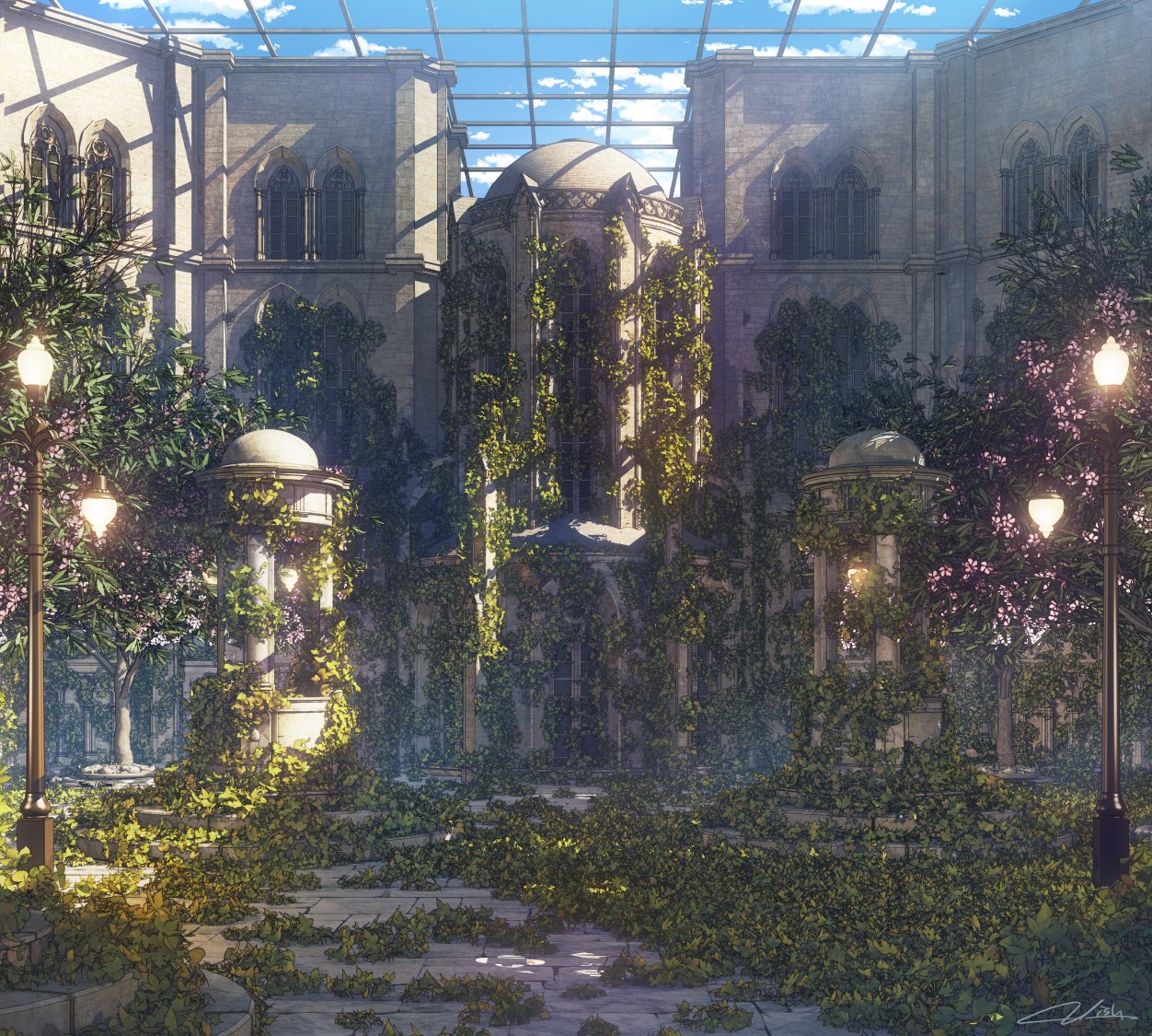 architecture blue_sky cloud commentary_request day dome flower lamppost leaf no_humans original overgrown pink_flower plant scenery signature sky tree vines waisshu_(sougyokyuu) window