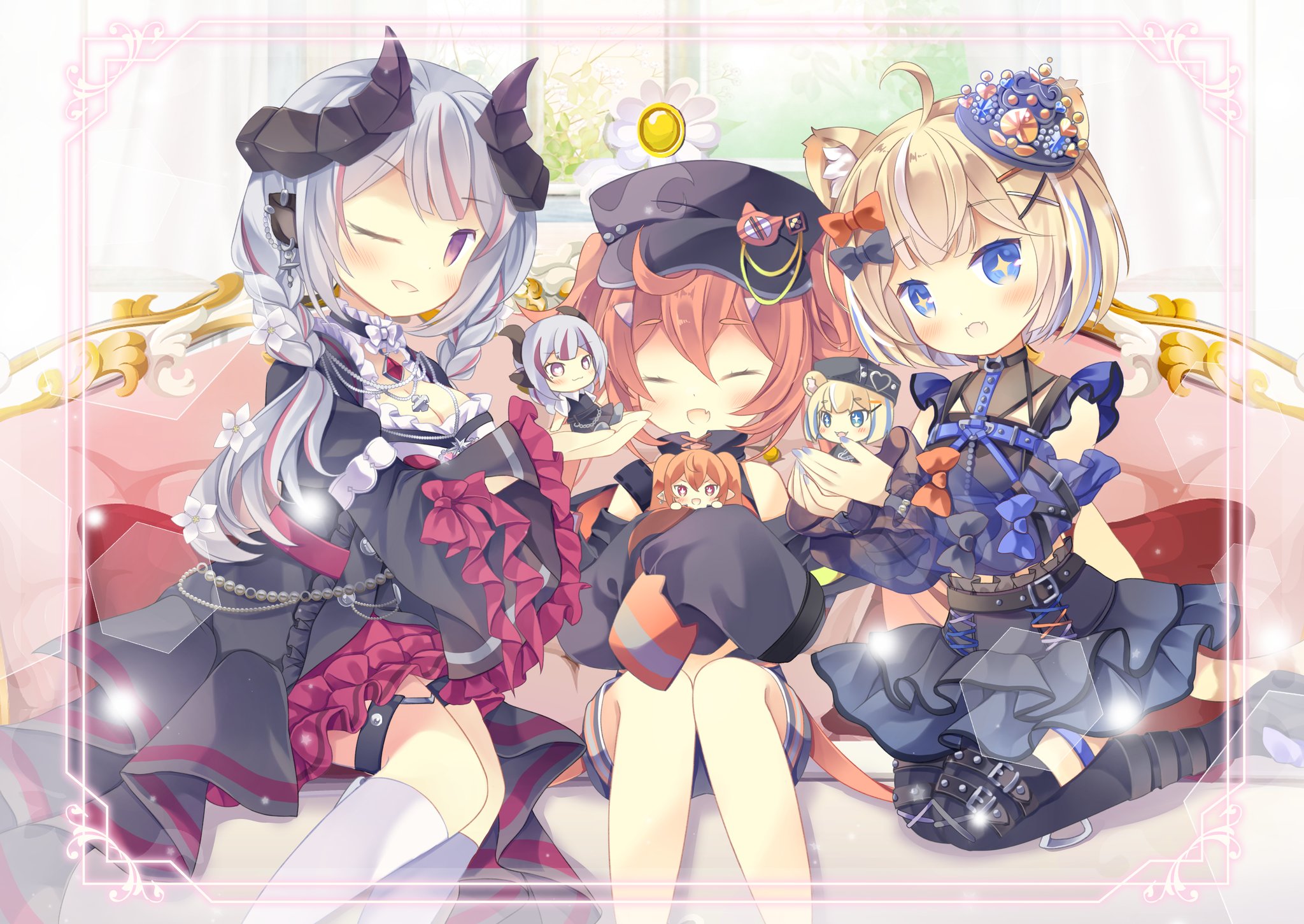 3girls animal_ear_piercing animal_ears black_dress black_hat black_sleeves blonde_hair blue_eyes blue_nails blush boots bow character_doll chikafuji_lisa choker commission cowlick cross cross_necklace detached_sleeves doll dress enya_ignis fang fangs flower frilled_dress frilled_sleeves frills grey_hair hair_bow hair_flower hair_ornament hat highres holding holding_stuffed_toy horns chromashift jewelry long_hair long_sleeves looking_at_viewer multicolored_hair multiple_girls necklace open_mouth orange_hair purple_eyes shabel_tonya sheep_ears sheep_girl sheep_horns shorts sitting skeb_commission skin_fang skin_fangs sleeves_past_fingers sleeves_past_wrists smile socks streaked_hair stuffed_toy tail thigh_boots thigh_strap tiger_girl tiger_tail twintails umaiitiyabosi1 virtual_youtuber white_socks