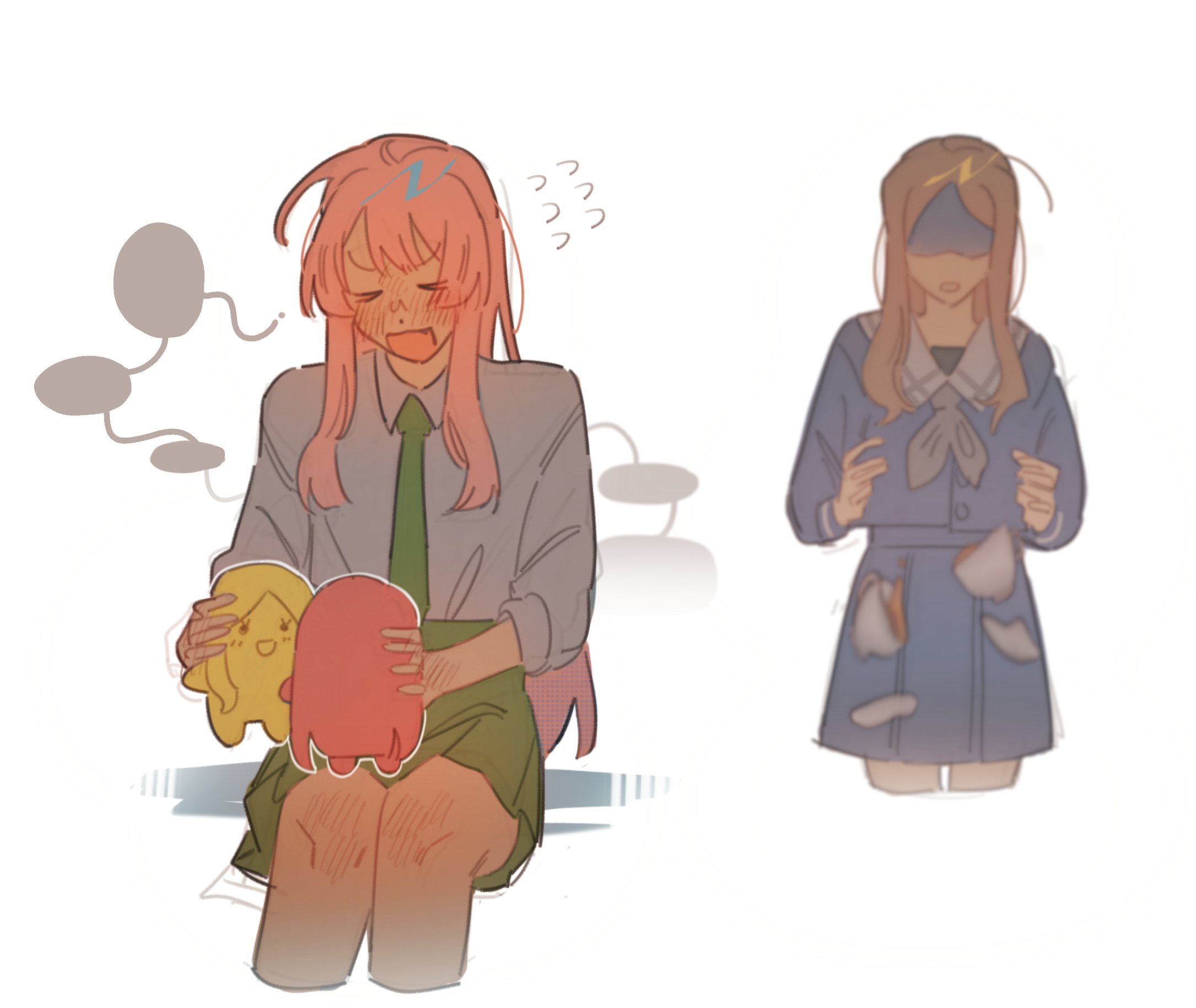 >_< 2girls bang_dream! bang_dream!_it's_mygo!!!!! blank_speech_bubble blue_shirt blue_skirt blush brown_hair character_doll chihaya_anon closed_eyes cup doll flying_sweatdrops green_necktie green_skirt grey_neckerchief hand_blush haneoka_school_uniform highres long_hair michiiyuri multiple_girls nagasaki_soyo neckerchief necktie open_mouth pink_hair pleated_skirt sailor_collar saucer school_uniform shaded_face shirt skirt sleeves_rolled_up speech_bubble teacup white_sailor_collar white_shirt