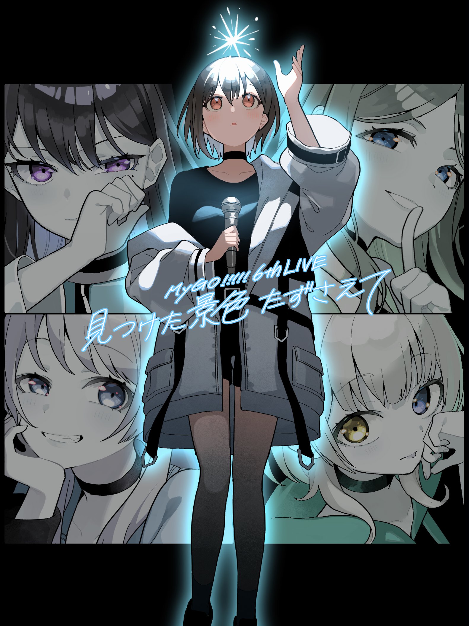 5girls bang_dream! bang_dream!_it's_mygo!!!!! black_choker black_shirt black_shorts blue_eyes blue_outline brown_eyes brown_hair chihaya_anon choker clenched_teeth closed_mouth collarbone commentary finger_to_mouth grey_eyes grey_hair group_name hair_between_eyes head_rest heterochromia highres holding holding_microphone index_finger_raised jacket kaname_raana kashi-k microphone mole mole_under_eye multiple_girls mygo!!!!!_(bang_dream!) nagasaki_soyo open_clothes open_jacket open_mouth outline parted_bangs pink_hair purple_eyes shiina_taki shirt short_hair shorts shushing sidelocks single_off_shoulder takamatsu_tomori teeth tongue tongue_out translation_request white_hair white_jacket yellow_eyes