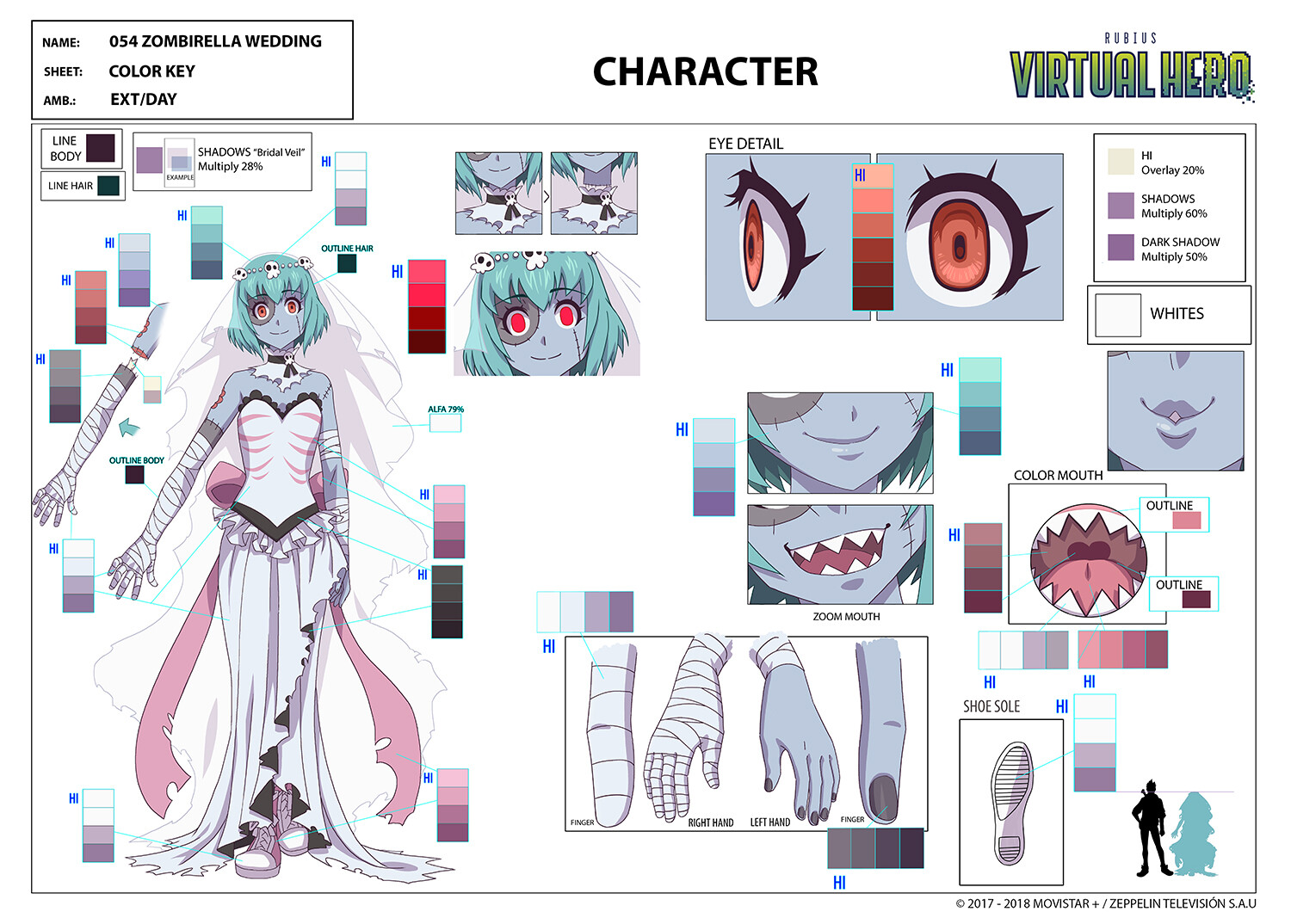 1girl bandaged_arm bandages blue_hair blue_skin bridal_veil color_guide colored_skin dress english_text hair_ornament hair_ribbon lolita_aldea looking_at_viewer official_art open_mouth original red_eyes ribbon sharp_teeth shoes short_hair simple_background skirt skull_hair_ornament smile solo stitched_face stitches teeth veil virtual_hero wedding_dress zombie zombirella
