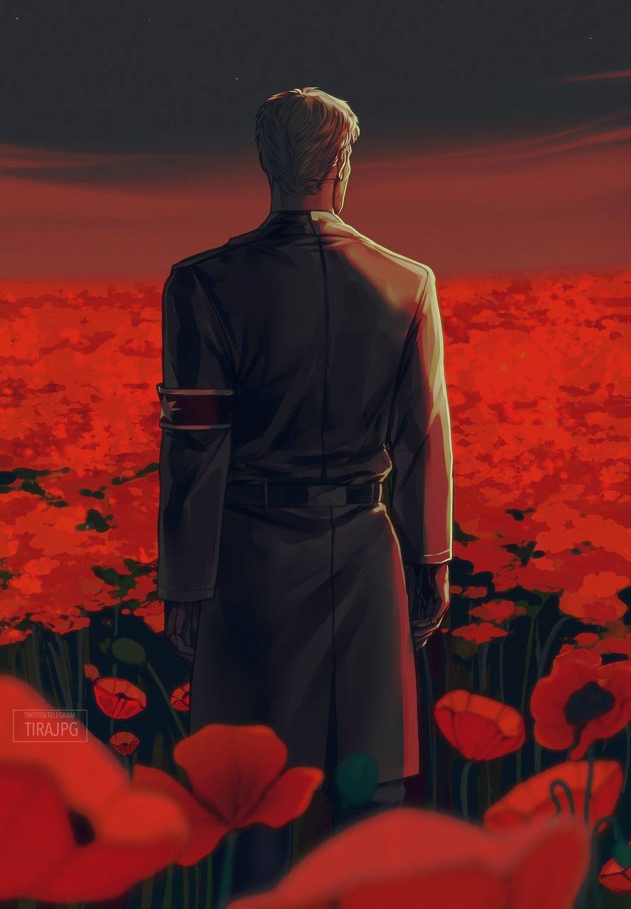 1boy armband black_gloves blonde_hair brown_coat coat commentary feet_out_of_frame field flower flower_field from_behind gloves hashtag-only_commentary highres looking_to_the_side male_focus marley_military_uniform red_armband red_flower red_sky red_theme reiner_braun shingeki_no_kyojin sky solo tirajpg trench_coat twitter_username